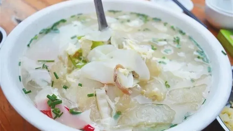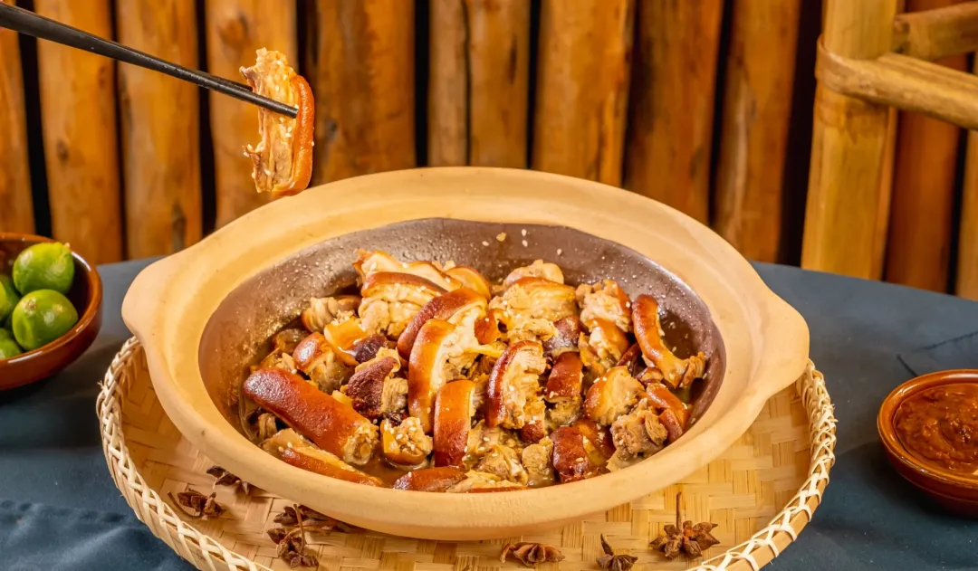 选用农家大猪厚皮,经晒干、油炸后炖煮,配酸笋、小虾、黄灯笼辣椒和酸橘,最后淋蛋花。汤色清亮却酸辣开胃,猪皮脆嫩弹牙,富含胶原蛋白,既解馋又养颜,是万宁餐桌上的“醒胃神器”。