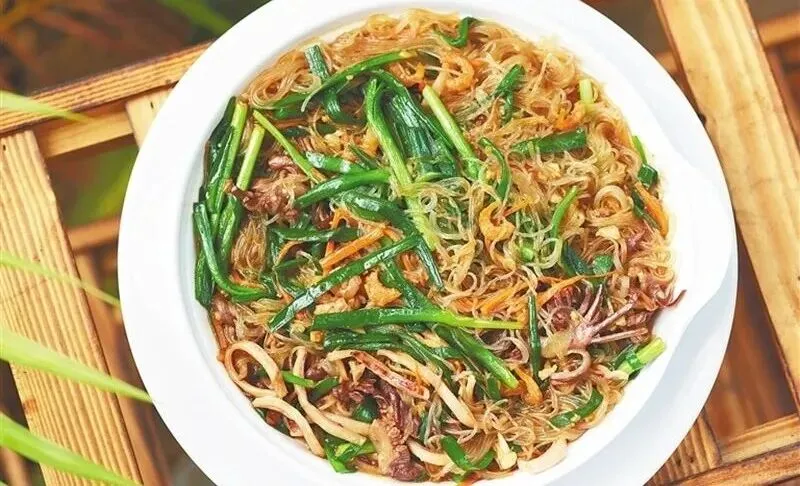龙滚菜是万宁龙滚镇的宴席头道菜,主料是粉丝和韭菜,灵魂在于爆香的鱿鱼干与虾米。猛火快炒,鲜香扑鼻,口感爽脆又不失嚼劲,每逢军坡节或红白喜事,这道菜必先上桌。