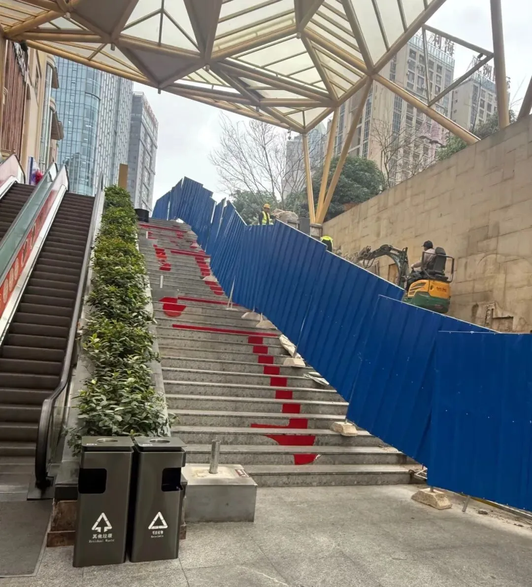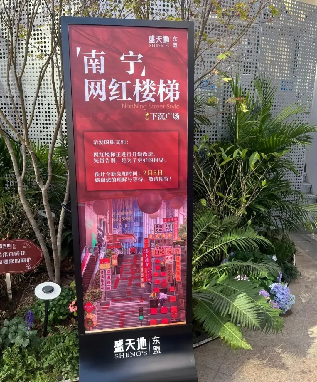 最近,本来打算去打卡的,可是来到这里,已经看不到原来的模样了。听说是要升级改造,目前东盟盛天地的大楼梯已经围起来了,原本极具特色的背景布置也已经拆除,现场正在施工。