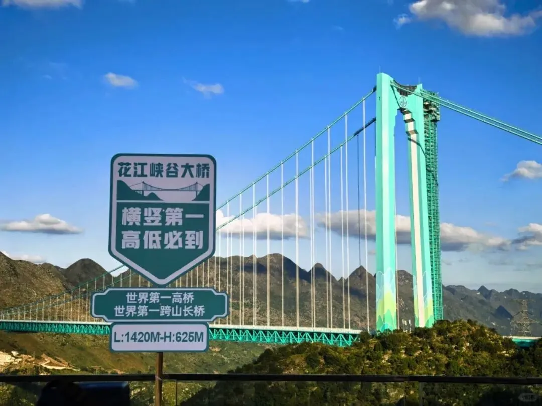 乘车前往【花江峡谷大桥】是中国贵州省高速通道,位于贵州省安顺市关岭自治县与黔西南州贞丰县交界处北盘江花江段、国家3A级景区花江大峡谷风景区上空,大桥为钢桁梁悬索桥。该大桥是贵州六枝至安龙高速公路的关键控制性工程,全长2890米,主桥跨径1420米,桥面到水面高度625米,主桥跨径居山区桥梁跨径世界第一、桥梁高度居世界第一,被称为“横竖”都是世界第一,游览结束前往兴义入住酒店。🏆桥面高度:世界第一 🏆桥梁结构:世界第一 🎯横竖都是第一,王炸,双料世界冠军!