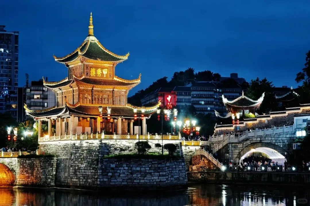 后乘车前往【甲秀楼】,甲秀楼始建于明万历二十六年(1598年),以河中一块巨石为基设楼宇,历代屡加修葺,现存建筑为清宣统元年(1909年)重建遗存。甲秀楼分上下三层,均以白石为栏,层层收进,由桥面至楼顶高约20米;南明河从楼前流过,汇为涵碧潭;楼侧由石拱“浮玉桥”连接两岸,桥上有小亭名“涵碧亭”;整体朱梁碧瓦,三层三檐四角攒尖顶。甲秀楼是贵阳历史的见证,文化发展史上的标志。夜幕降临,华灯初上,人流如织,热情高涨,夜幕灯光照耀下的甲秀楼,金碧辉煌,是贵阳千年的见证。