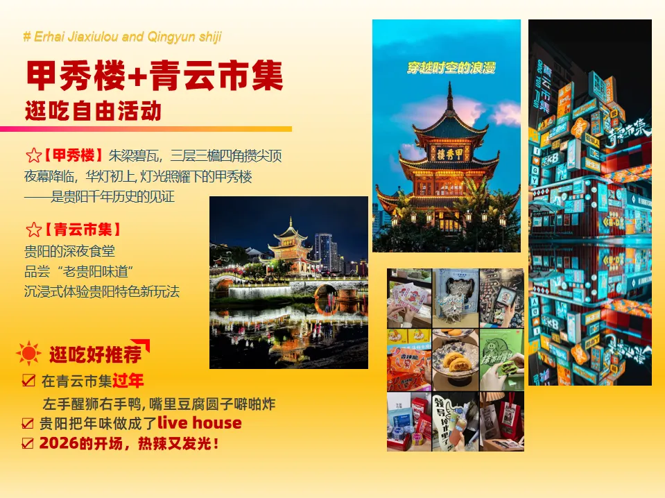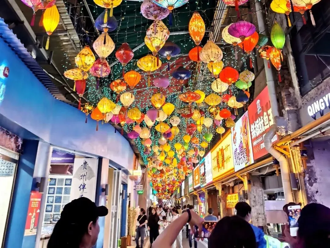 之后前往贵阳网红打卡地【青云市集】,青云市集位于南明区青云路,素有贵阳“深夜食堂“之称,是贵阳市民和游客必逛的美食街区,浓厚的烟火气让这里形成了独特的美食文化。到了贵阳,一定要去青云市集,美美地感受夜色市井生活下独有浪漫,尽享着这里的不一样的潮玩体验,品尝“老贵阳味道”,沉浸式体验贵阳特色新玩法。