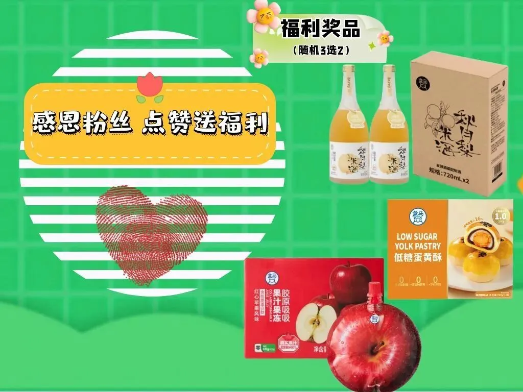 ♥奖品随机3选2(秋月梨米酒、低糖蛋黄酥、果冻吸吸苹果味),逢周一公布名单,免费快递到家。