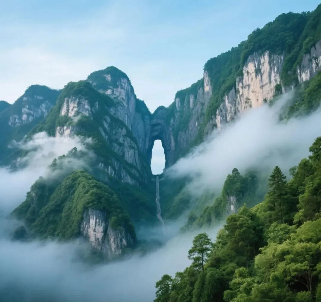 天门山因天然穿山溶洞“天门洞”而得名,被誉为“张家界之魂”1。乘坐世界最长的高山客运索道,7.5公里高空俯瞰99道弯盘山公路,震撼无比。抵达山顶后,可走西线玻璃栈道与鬼谷栈道,悬崖峭壁间步步惊心。从山顶下至天门洞广场,可选择世界最高穿山电梯(12段,半小时直达),或挑战999级“天梯”徒步而下。每年翼装飞行、飞机穿洞等极限赛事在此上演,惊险刺激,令人难忘1。