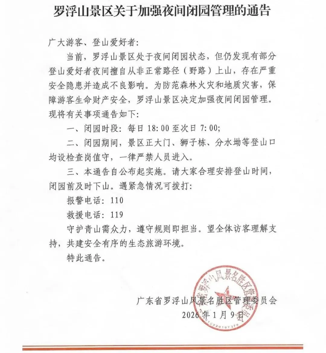 近日,罗浮山风景名胜区管理委员会发布《关于加强夜间闭园管理的通告》(以下简称《通告》),进一步明确夜间闭园时段(每日18:00至次日7:00)管理措施。