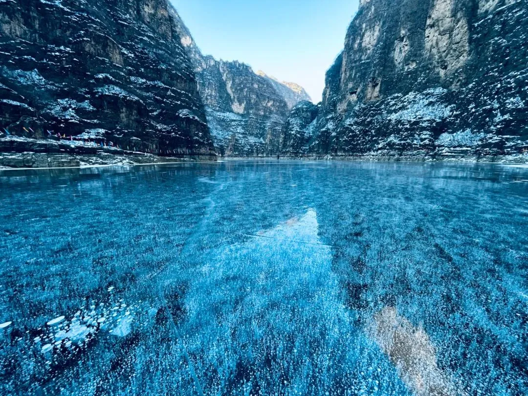 冰川峡谷中神奇壮美的“气泡冰”成为一大特色亮点,被游客赞誉为“北京的贝加尔湖”。