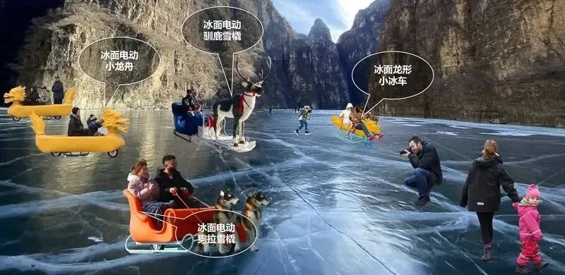 这里有好玩的香蕉船、冰面龙行小冰车、冰面雪圈、小火车等冰上娱乐项目。更有冰河狂野UTV,让景区专业车手带领你体验冰面漂移、极速飞速,既惊险又刺激!