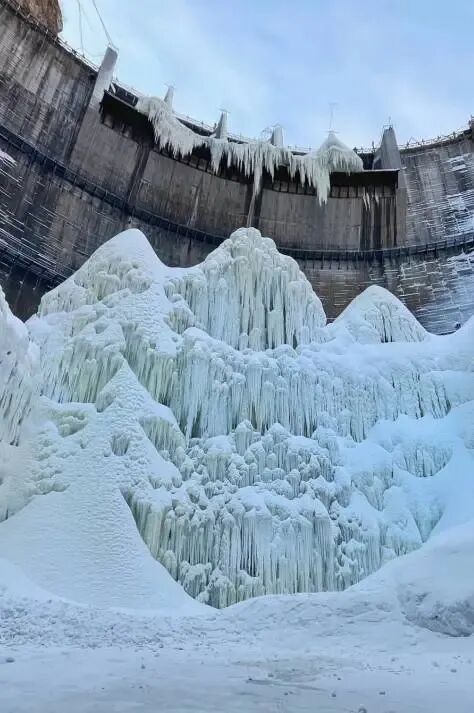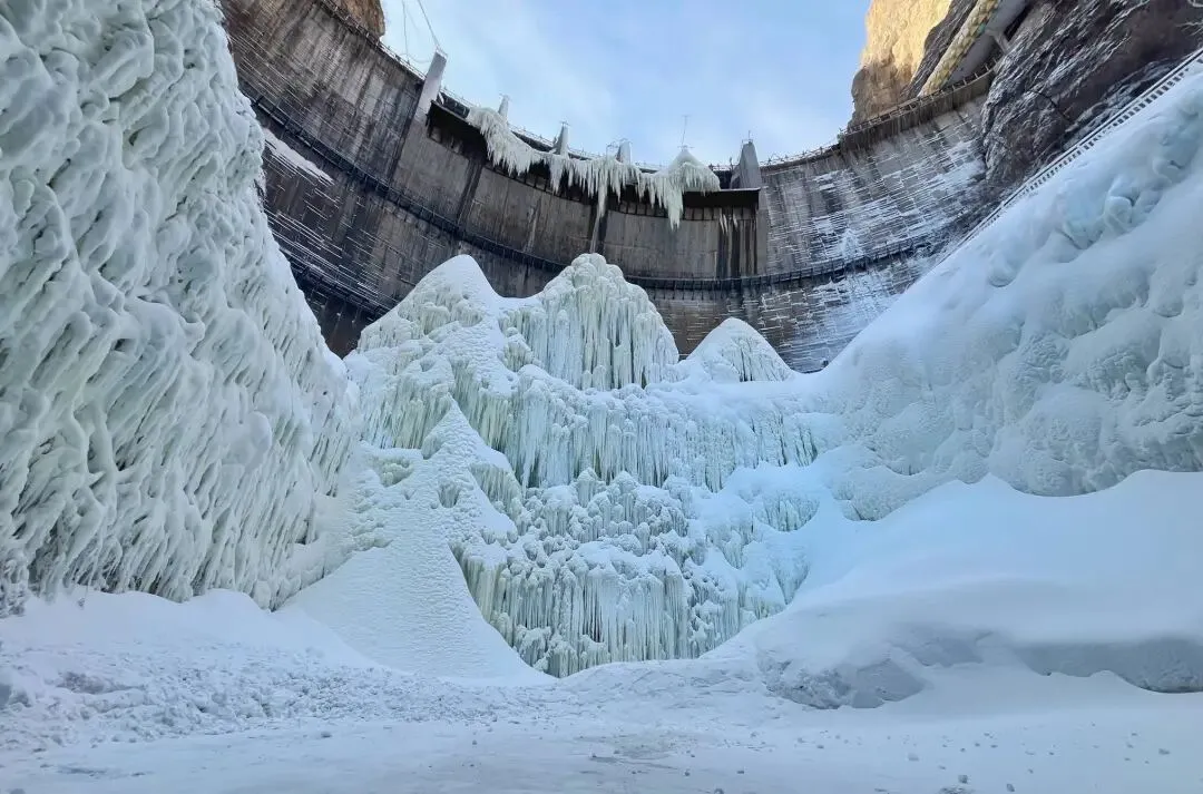 龙庆峡最壮阔的冰雕,来自于大自然的鬼斧神工——顺70米高的水库大坝飞流直下巨大冰瀑,下饰冰花、冰柱,形成一座飞流千尺晶莹剔透的冰瀑奇观,是绝对的网红打卡点!