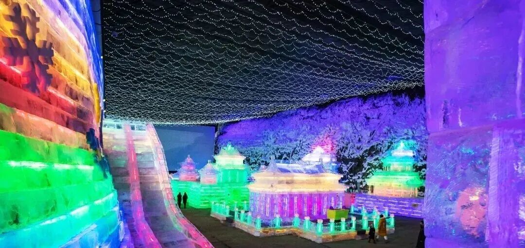 之后我们排队进入景区,顺着景区规划的游览路线,我们可以看到树上挂着的彩灯、室外的雪雕、冰棚里的大型冰雕、冰瀑,还可以从“巨龙”的“龙口”进入,乘坐亚洲最长的景区电梯,上到冰瀑的坝顶看感受一下刺激。还有雪滑梯,滑雪等娱乐项目,小孩子可玩个够啦!