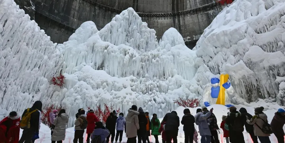 冰川峡谷区的 “气泡冰” 被游客誉为 “北京的贝加尔湖”,尽显原始蛮荒之美;而 70 米高水库大坝形成的巨型冰瀑,经人工修饰冰花、冰柱后,成为壮观的冰瀑景观,此外冰川飞瀑区还新增气膜灯与精品雪雕,让自然冰景和人工艺术进一步融合,提升了视觉效果。