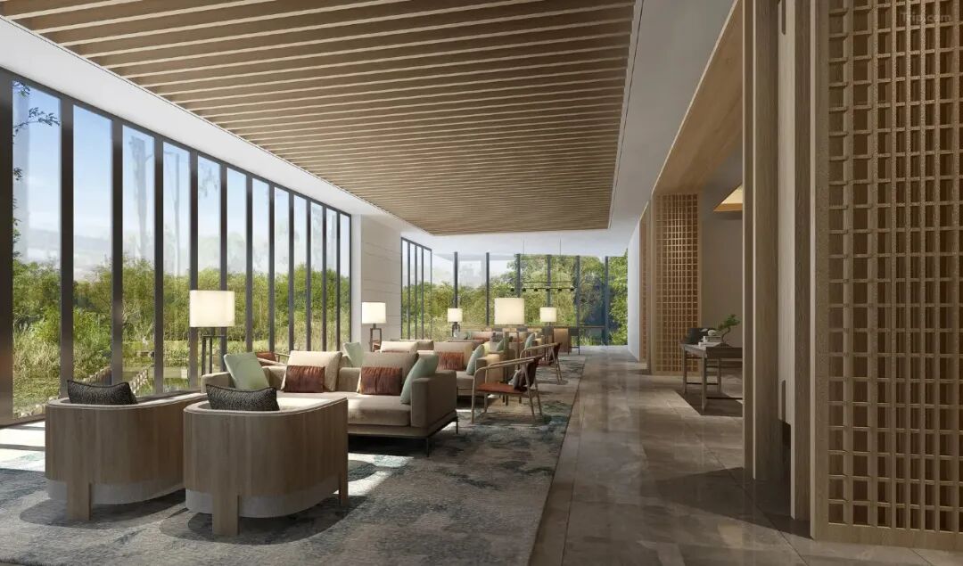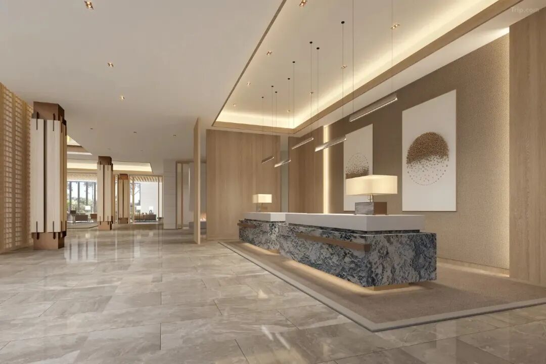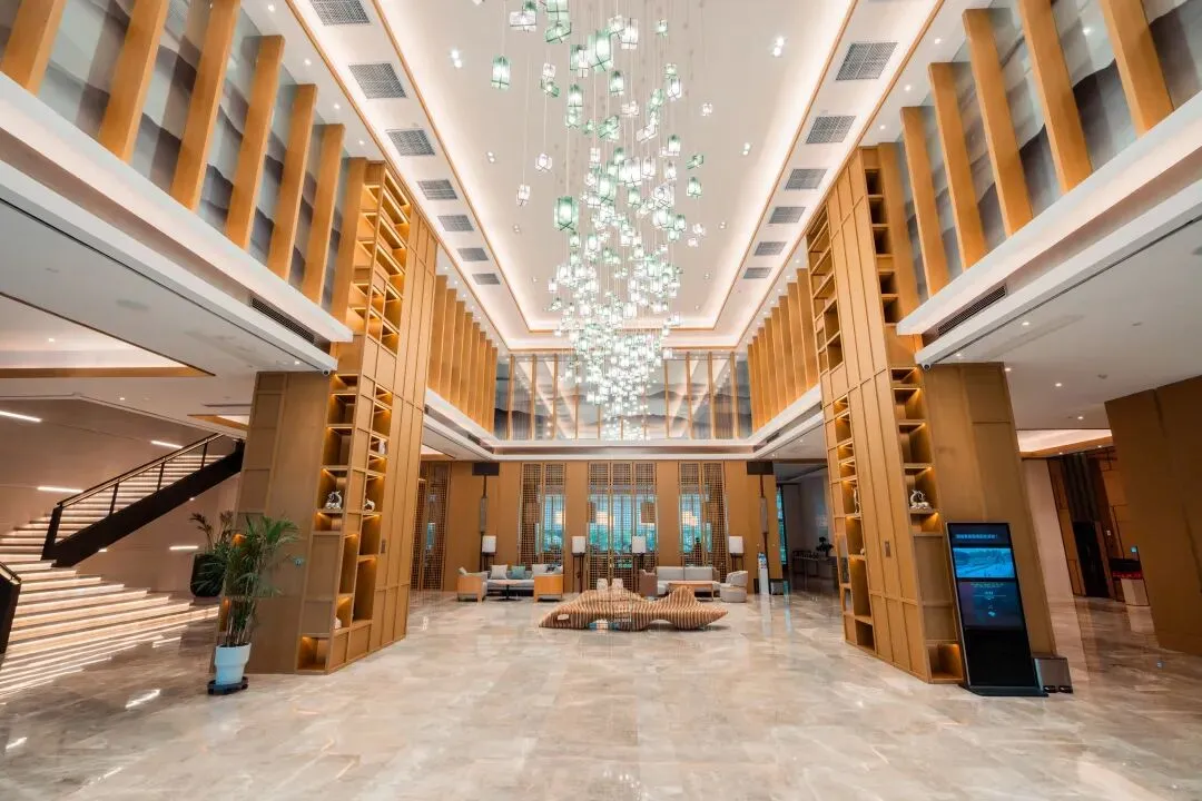 步入酒店大堂,挑高设计搭配灵动的曲线造型瞬间拉满空间感,璀璨的吊灯与窗外涌入的绿意相映成趣,营造出开阔而静谧的氛围。纹理粗犷的墙面装饰呼应森系主题,恰到好处的绿植点缀让自然气息渗透每个角落。