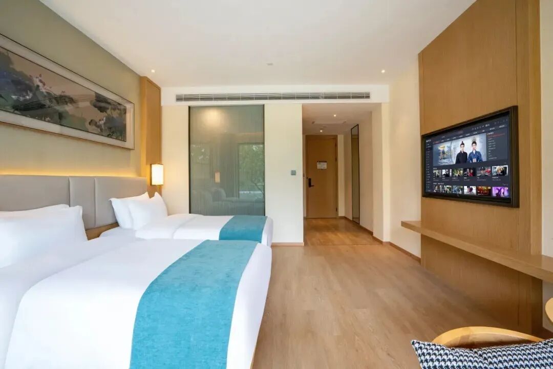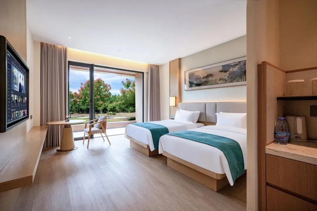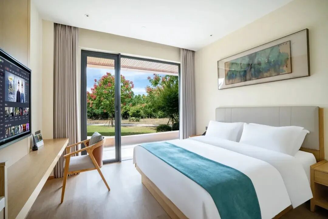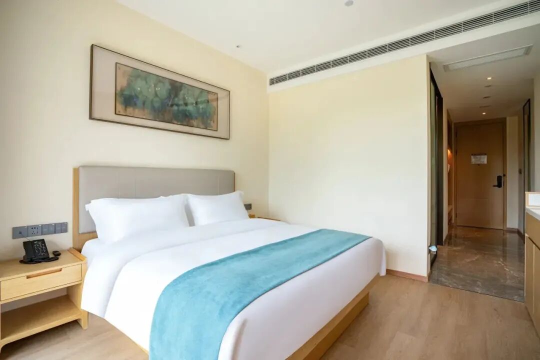 酒店客房以“森系观景”为核心特色,每间客房均采用现代别致的装修风格,布置简洁而不失质感。客房空间宽敞搭配了超大面积落地窗及阳台。