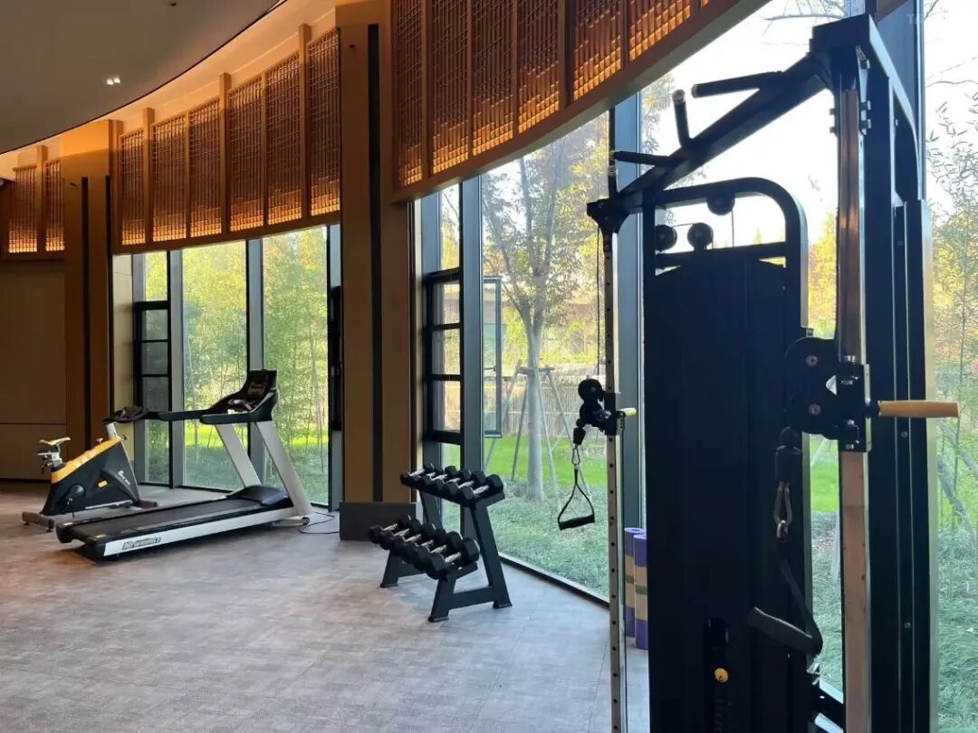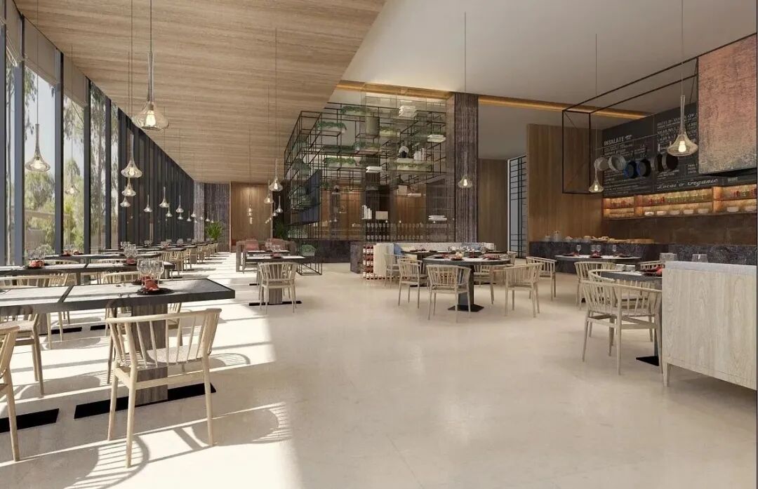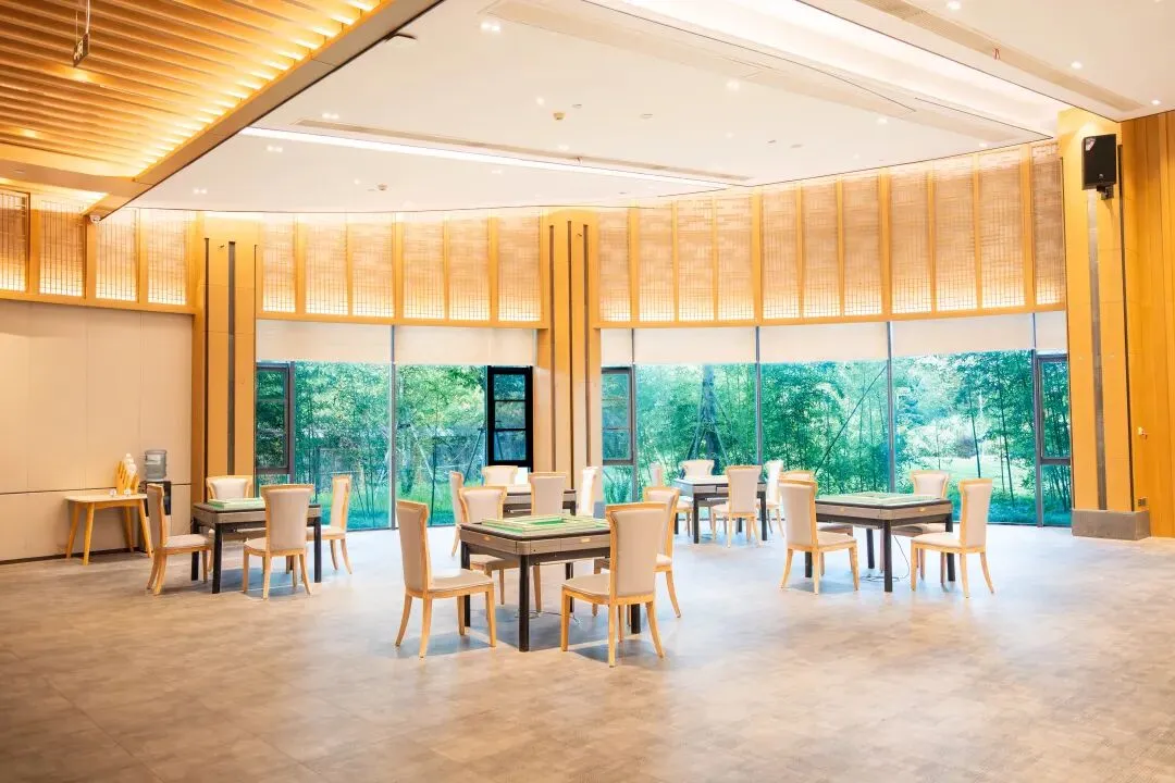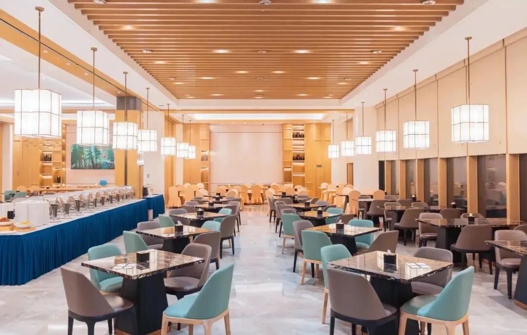 酒店餐厅豪华气派、宽敞明亮,大面积观景窗让用餐过程成为视觉与味觉的双重享受——一边品尝美食,一边欣赏窗外杉林水景,氛围感十足。