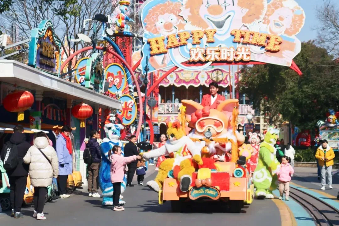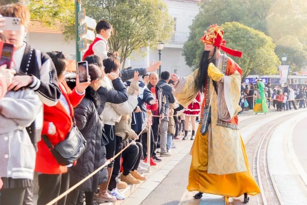 “新春快闪秀”“财神拜年”“考拉见面会”等主题活动轮番上演,华丽的花车列队与华服交相辉映,演职人员随乐起舞,满载喜悦,带着美好祝福与游客们共同开启新篇章。潮汕英歌舞团的到来,为欢乐谷增添了一股磅礴的气势。铿锵有力的鼓点仿佛敲在人们的心上,堪称“新年最强气氛组”。