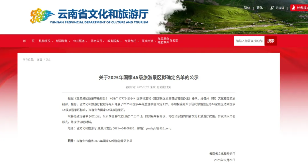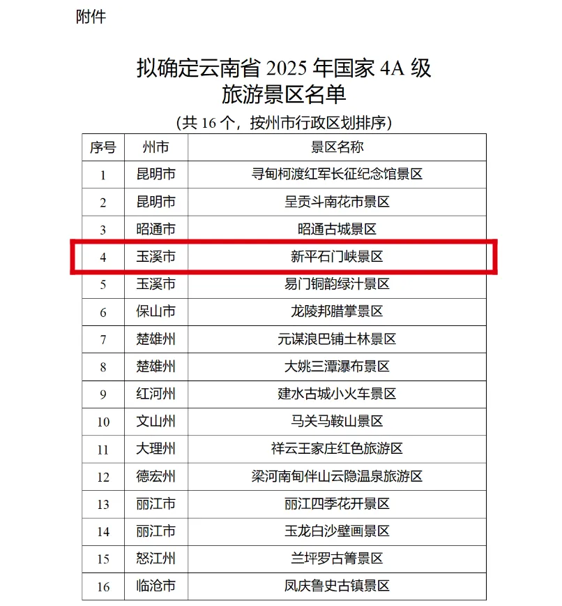 近日,云南省文化和旅游厅网站发布《关于2025年国家4A级旅游景区拟确定名单的公示》寻甸柯渡红军长征纪念馆景区等16家景区达到国家4A级旅游景区的标准,拟确定为国家4A级旅游景区。新平又增加一个4A级景区——新平石门峡景区!!!