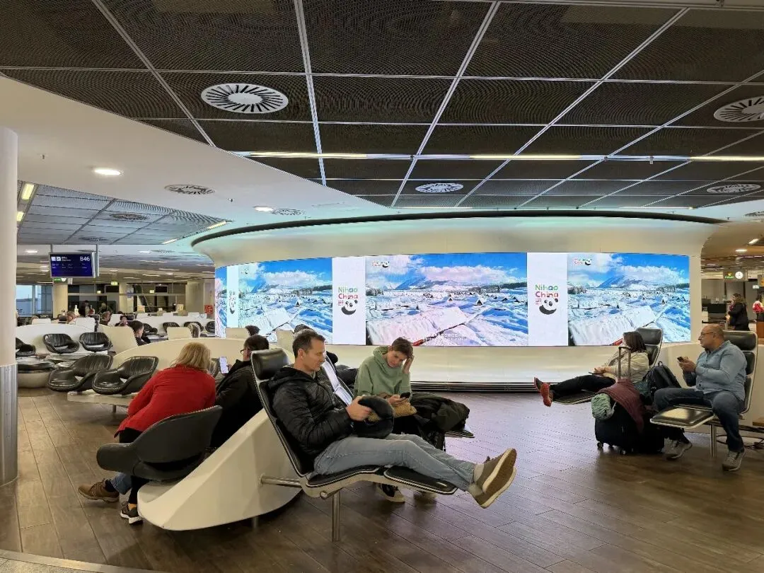 本次宣传延续了上一年度的成熟投放模式,于元旦过后正式启动。在法兰克福机场1号航站楼B区2层非申根出发区域,一块面积超过30平方米的弧形大型广告屏集中播放“你好!中国”主题宣传片、中国冰雪旅游海外推广季相关视频、以及中国多个省市的旅游宣传视频。该大屏位于多条中德航线的核心候机区域,旅客停留时间长、人流密度高,是机场内极具传播价值的展示点位。