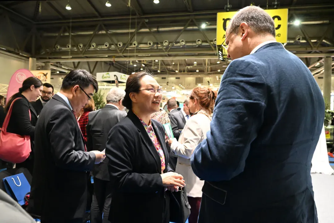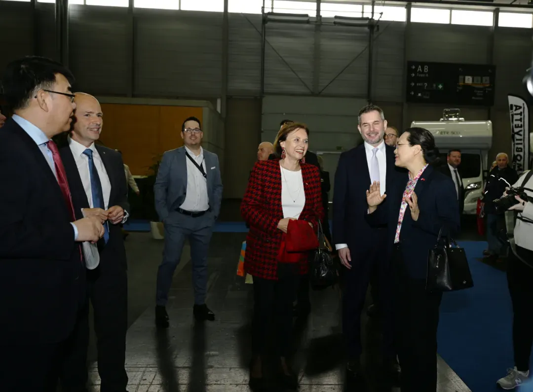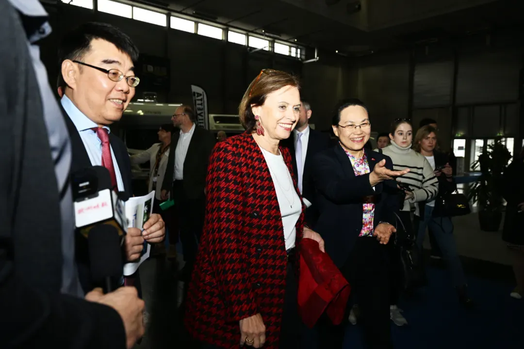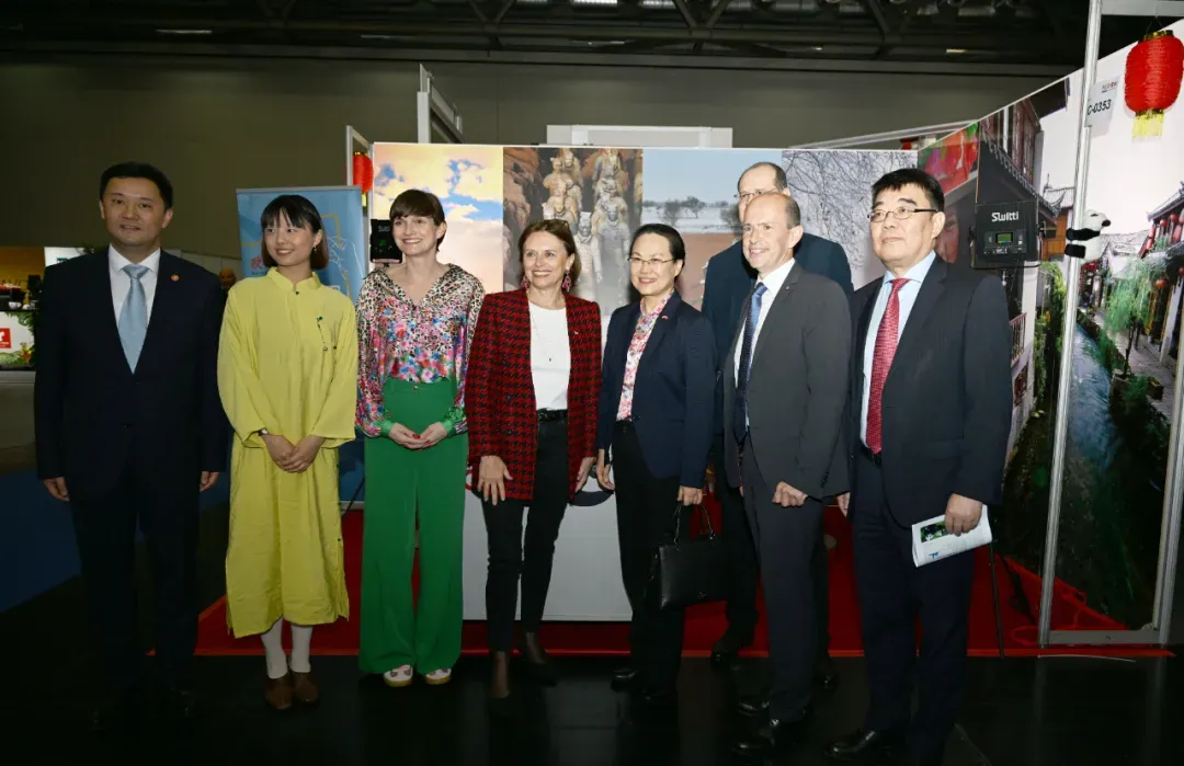 图为2024年3月14日,奥地利旅游国务秘书苏珊娜·克劳斯-温克勒(左四)在中国驻奥地利大使亓玫的带领下参观2024年维也纳国际旅游展中国展台