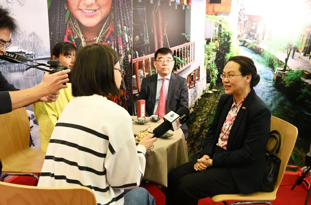 图为亓玫大使在2024年维也纳国际旅游展中国展台接受《欧洲时报》记者专访