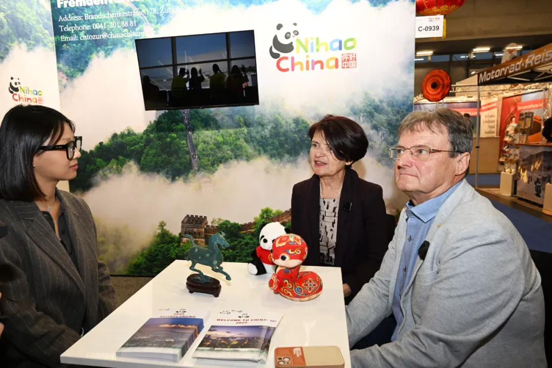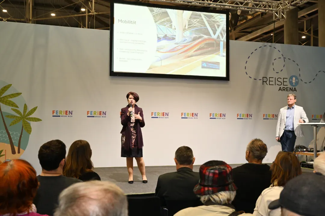 图为2025年维也纳国际旅游展开幕式上,一对独自前往中国自由行24天的奥地利夫妇Gertrude和Paul分享中国旅行攻略和感受