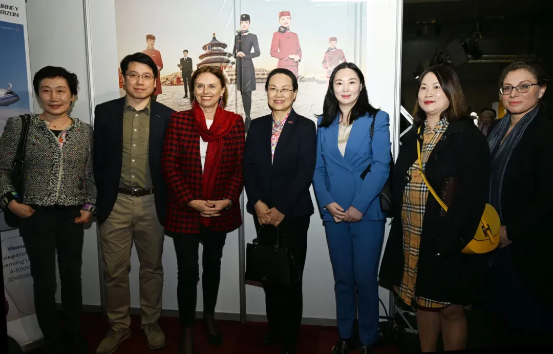 图为2024年3月14日奥地利旅游国务秘书苏珊娜·克劳斯-温克勒、亓玫大使、中国国际航空公司维也纳营业部总经理杜毅与中方参展、观展人员在国航展台合影