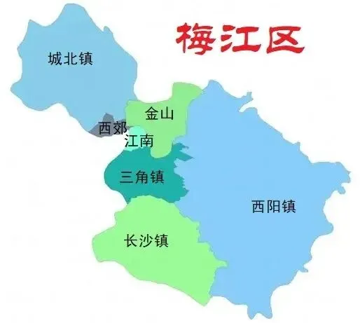 梅江区辖长沙镇、三角镇、城北镇、西阳镇4个镇和西郊街道、金山街道、江南街道3个街道。区政府驻金山街道仲元东路。
