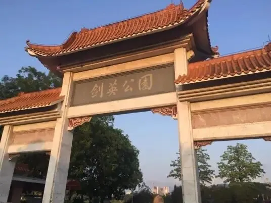 剑英公园位于梅州市梅江区江南新城中轴线起点,占地面积656,000平方米,是梅州市区规模最大的综合性城市公园。公园始建于1986年,1997年正式开园,正门门楼由刘宇新捐资建造,“剑英公园”四字为刘复之题写。2020年剑英纪念长廊建成开放,形成以革命历史纪念广场、国防教育军史长廊为核心的红色文化景观。公园核心区域由三个湖泊组成的剑英湖,水面面积26.7万平方米,通过石拱桥与游船码头相连,沿湖建有亲水栈道、亲水平台及儿童乐园等设施。2015年由梅州市嘉建投资建设有限公司与深圳市铁汉生态环境股份有限公司联合实施改造工程,总投资8亿元,新增梅州城市展览馆、青少年科技馆及透水步道系统,其中科技馆侧重科普互动,展览馆集中展示城市历史与规划成果,配套建设下沉主广场、市民广场及绿化工程提升生态功能。园内种植凤凰木、紫荆等景观花木,四季呈现不同花卉景观。作为梅州市中心城区重要公共绿地,公园兼具防洪蓄洪与应急避险功能,通过中水回用系统实现湖水补给,形成集生态休闲、红色教育、娱乐体验于一体的城市空间。