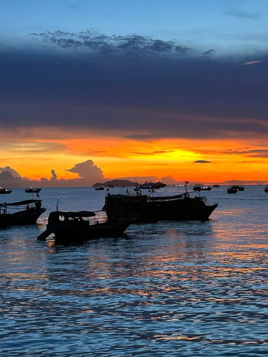 “鹿城”是三亚的简称,日落时分,夕阳将余晖洒在万顷碧波上,天边的晚霞、地上的霓虹灯与璀璨的星空、波光潋滟的大海交相辉映,形成“落霞与孤鹜齐飞,秋水共长天一色”的壮观景象。渔民们铿锵有力地喊着号子,满载丰收、欸乃归舟,正所谓“渔舟唱晚,响穷鹿城之滨”。