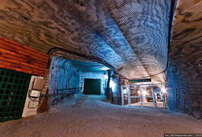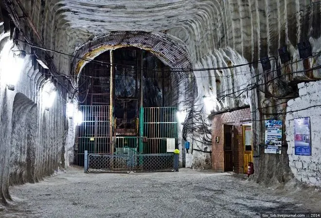 一百多年来,这里已经形成了一个长度约为 300 公里的开采系统,已经开采了超过 2.5 亿吨盐开采后,巴赫穆特盐矿的深度达到了 200-300 米。尽管开采量很大,但目前仅开发了矿床中可用盐的 3%。这里还被开发成了一个旅游景点,2014年时,曾有人探访了巴赫穆特盐矿,图为众多矿井井架之一。