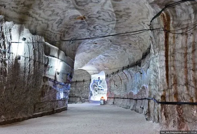 这个盐矿最大的魅力在于,这里仍然完好地保存着真正的盐矿开采痕迹:墙壁和拱顶上留有隧道掘进机的开采痕迹。