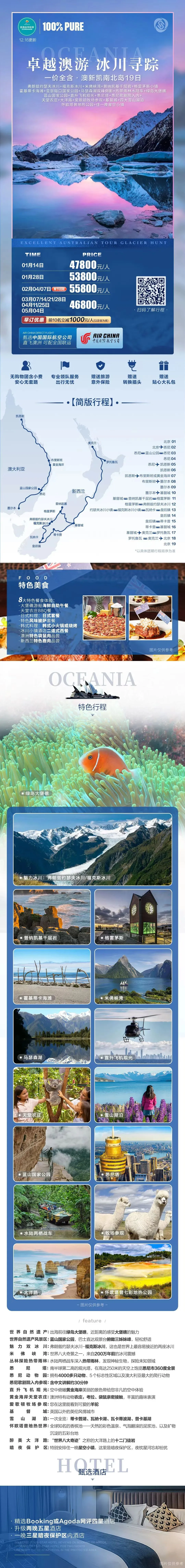 🚀 升级 🆙 一价全含 💰 卓越澳游 冰川寻踪 🏔 澳新凯墨南北岛19日 ✈ CA北京直飞各地联运 🌍