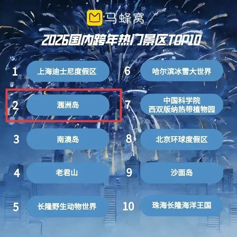 涠洲岛“热力”三榜齐登,实力领跑全国。在马蜂窝旅游网发布的“2026国内跨年热门景区TOP10”榜单中,涠洲岛荣登全国第二名。