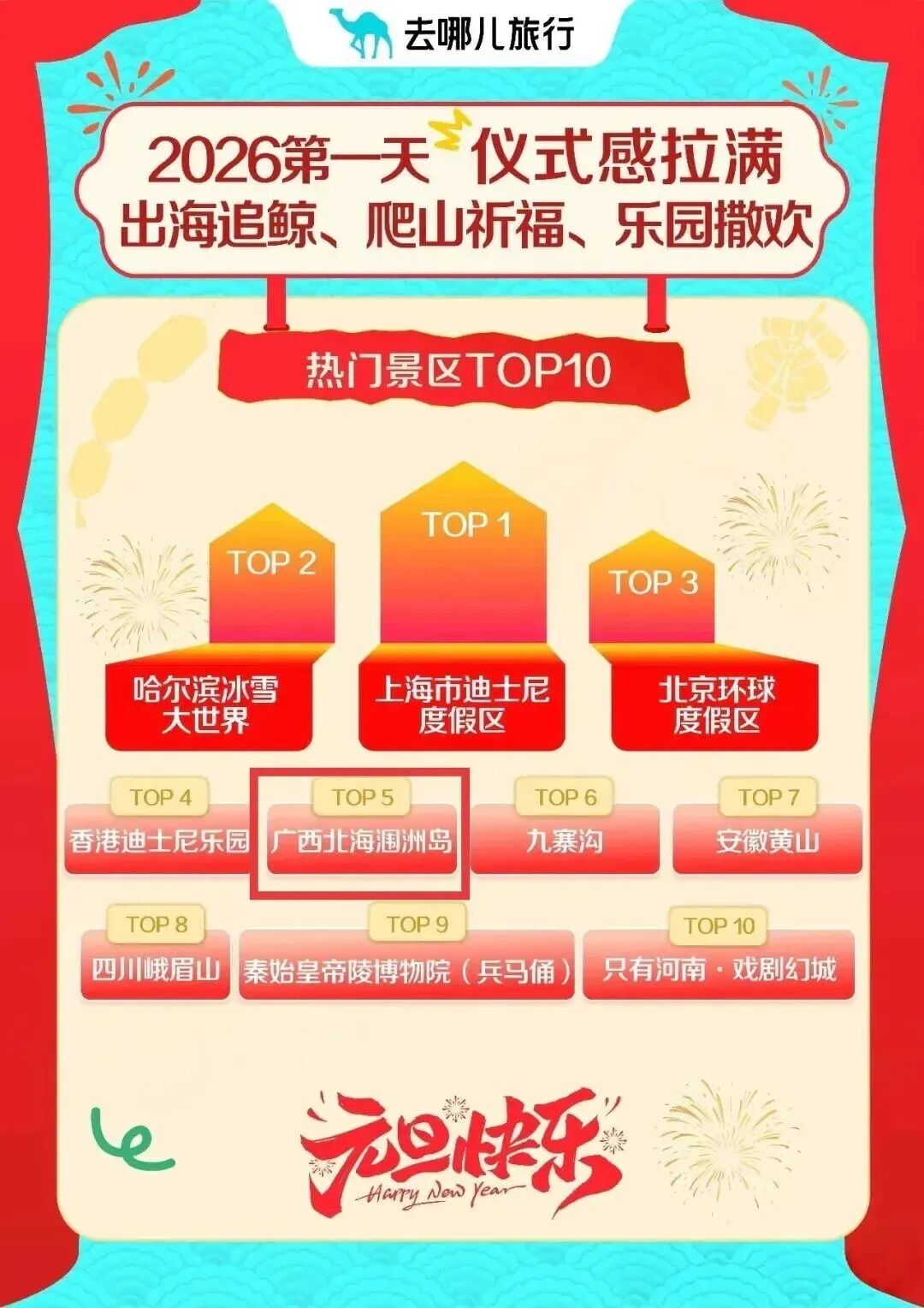根据去哪儿网公布的热门景区跨年热度数据,涠洲岛超越众多主题乐园,位于全国第二名,并跻身“2026第一天仪式感拉满”全国景区榜单TOP5,妥妥成为跨年热门景区“人气王”!