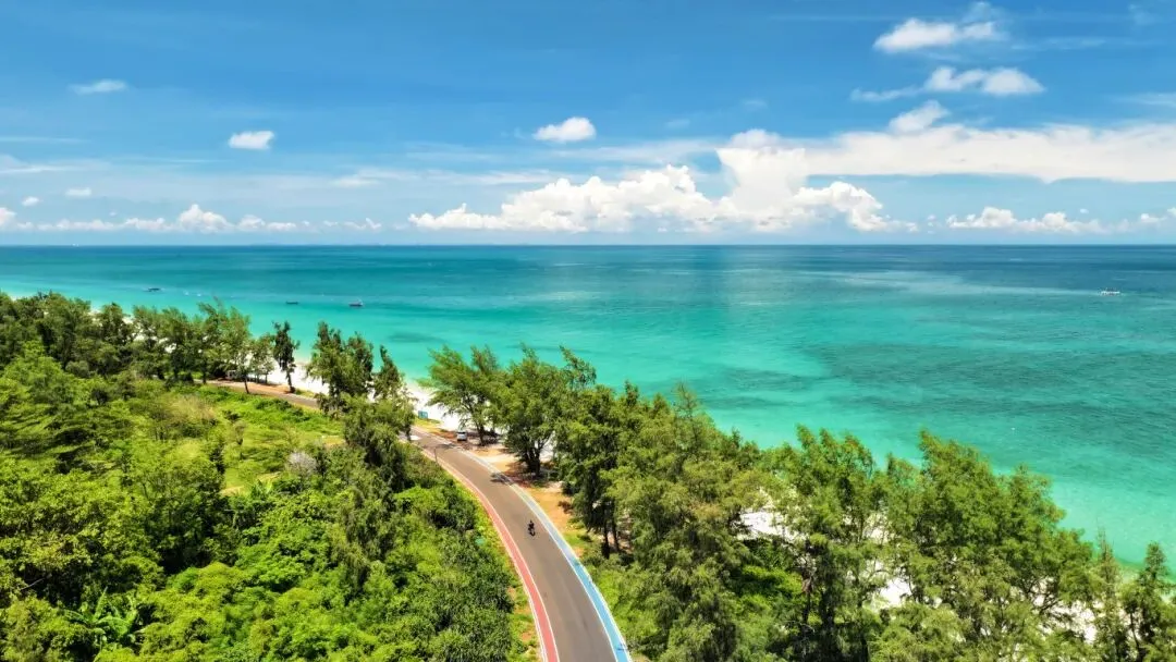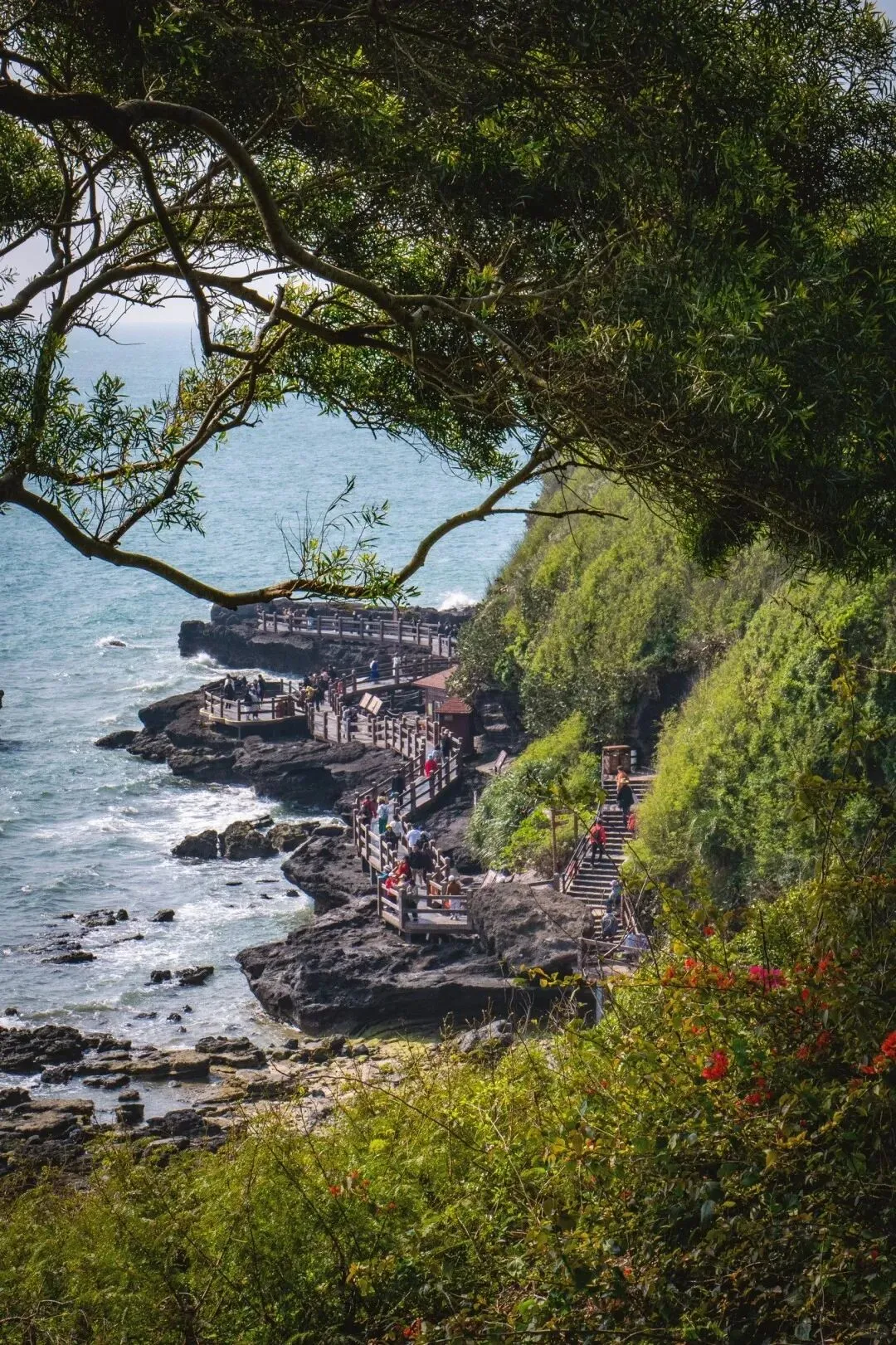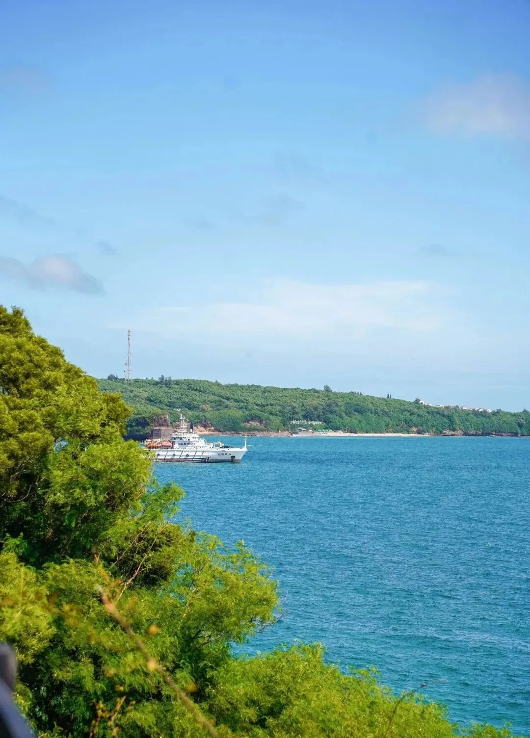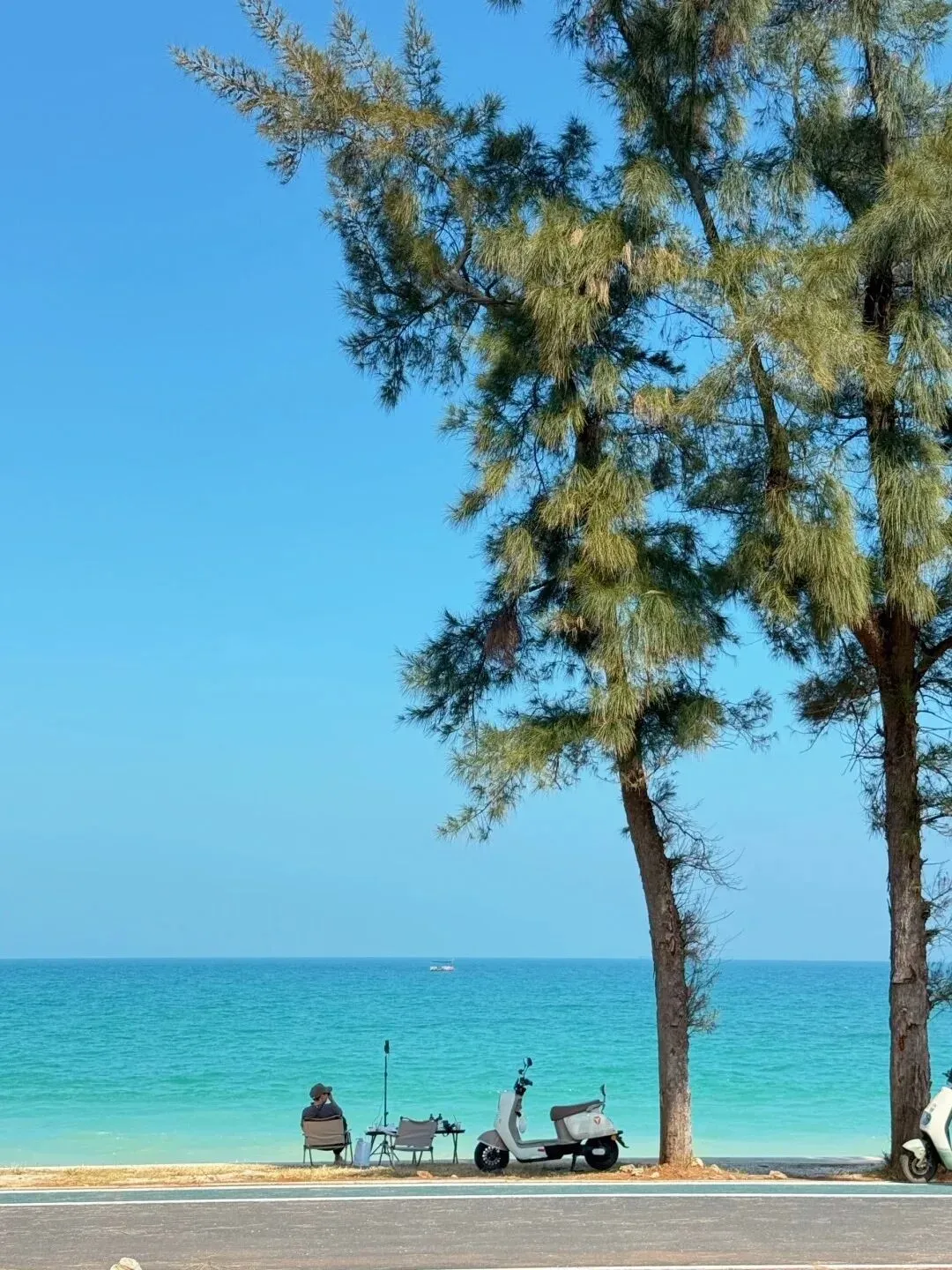 骑着电动车驶过这里,一侧是蔚蓝的大海,一侧是成片的绿荫,随手抓拍就是电影感画面。
