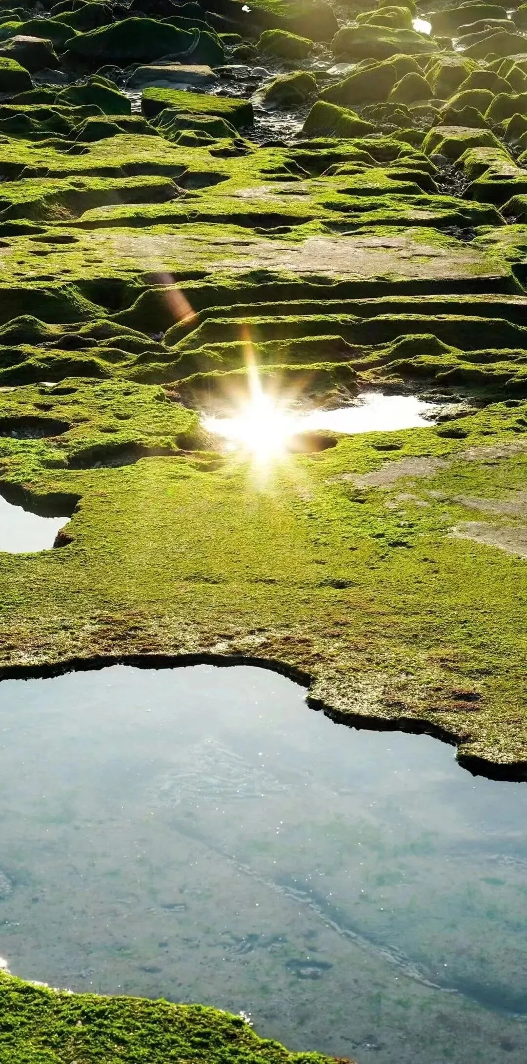 暖冬的气候为这里的海蚀平台蒙上一层绿色的藻类,形成独特的“抹茶沙滩”,远远望去,就像许多块抹茶生巧不规则地铺在海滩上,格外诱人。