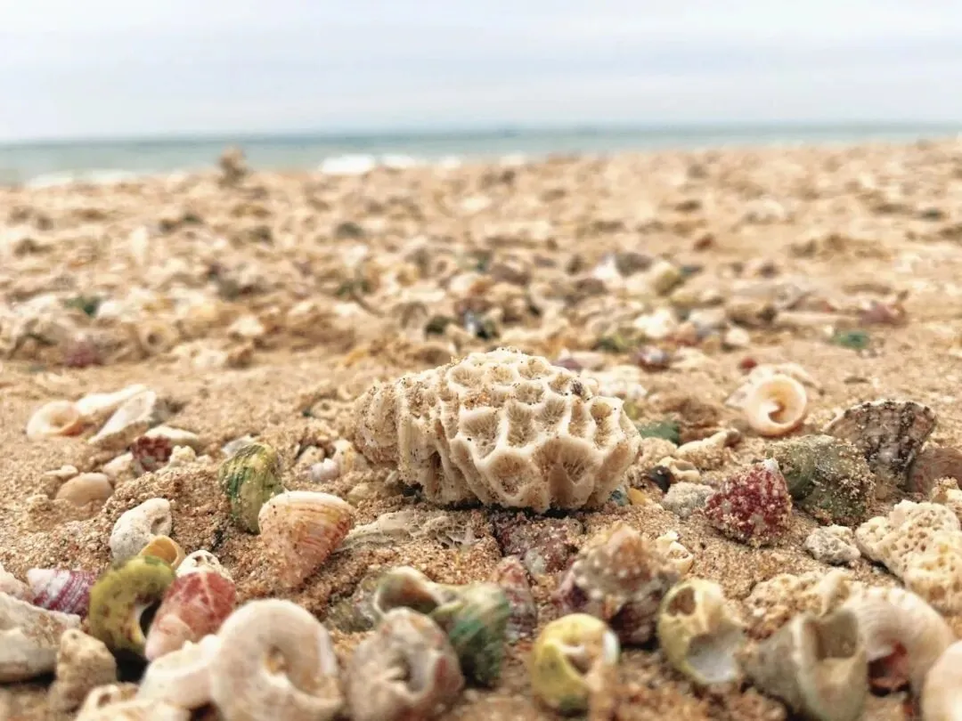 沙滩上散落着许多色彩斑斓的贝壳,退潮后还能在礁石缝里找到小螃蟹、小海螺,带着小桶来赶海,就能收获满满的童趣。
