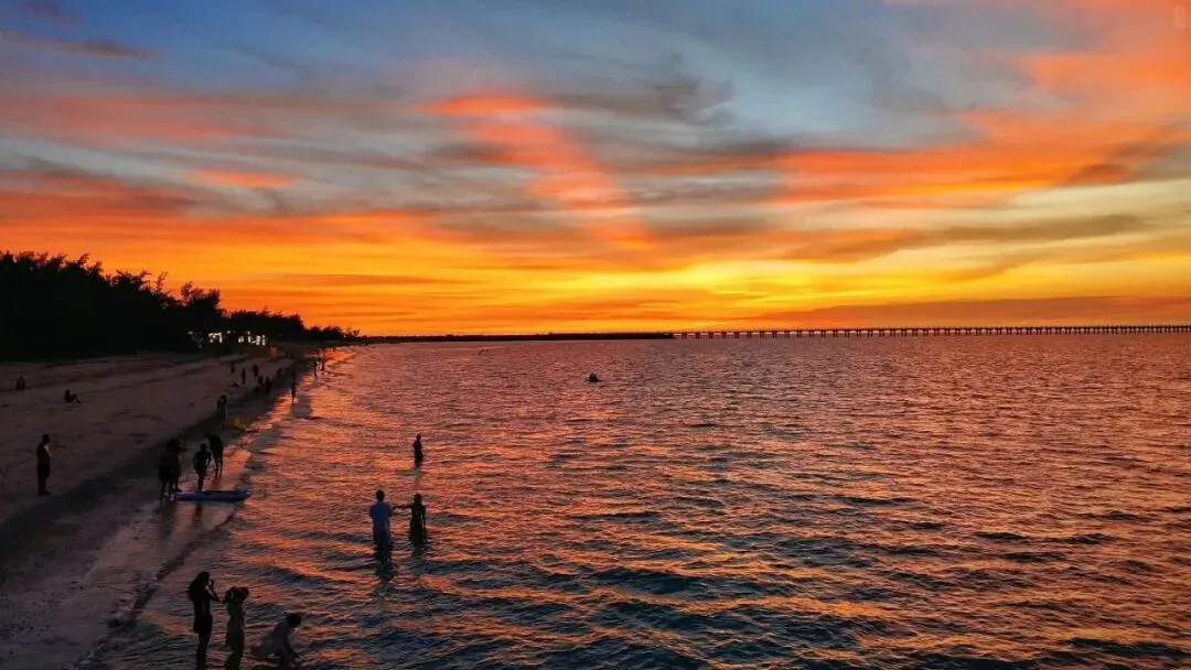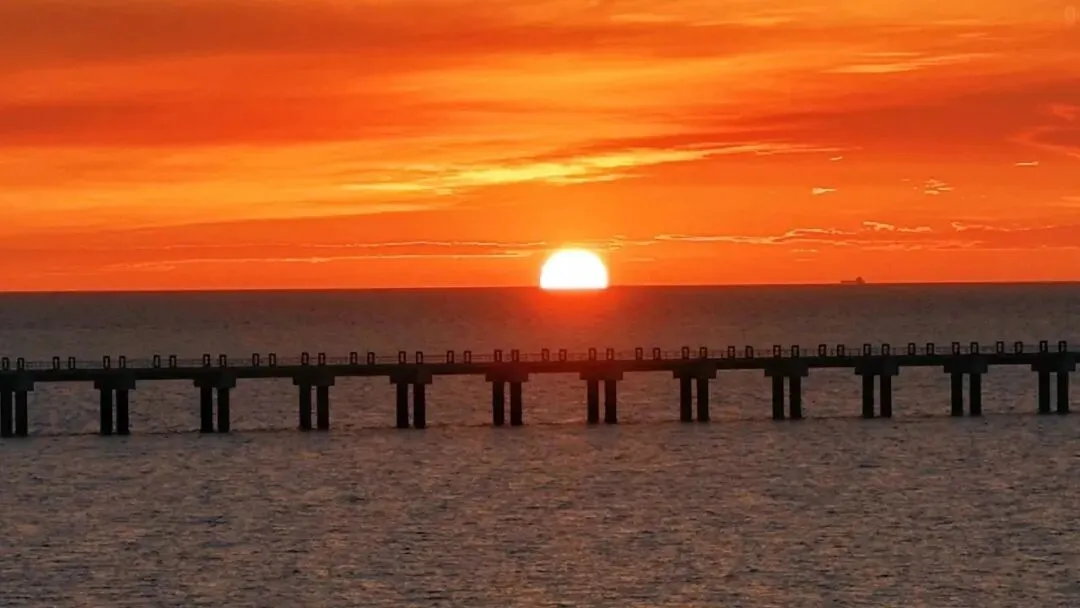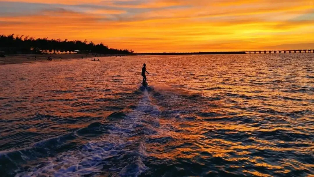 到了傍晚,夕阳为海面镀上一层鎏金,蓝桥在晚霞的映衬下变得格外神秘,青蓝渐变的海水慢慢过渡为鎏金般的橘子海,美得让人沉醉。