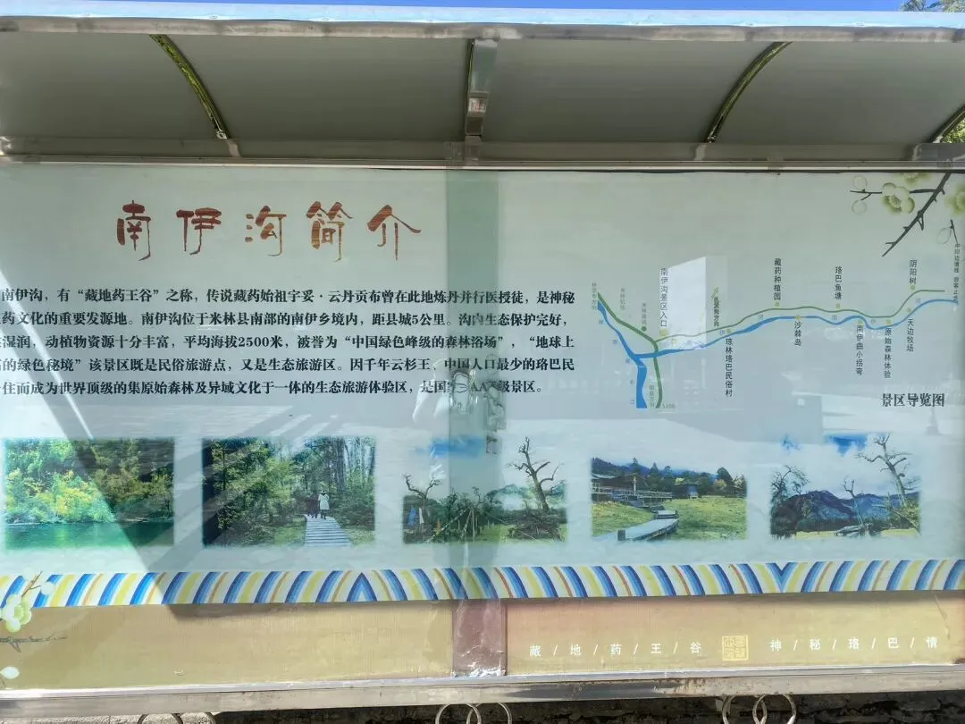 原始的南伊沟离米林县城有25公里,纵深45公里,沟内景色秀美,原始植被保护完好,气候湿润,动植物资源十分丰富,平均海拔2500米,被誉为“中国绿色峰级的森林浴场”、“地球上最高的绿色秘境”。