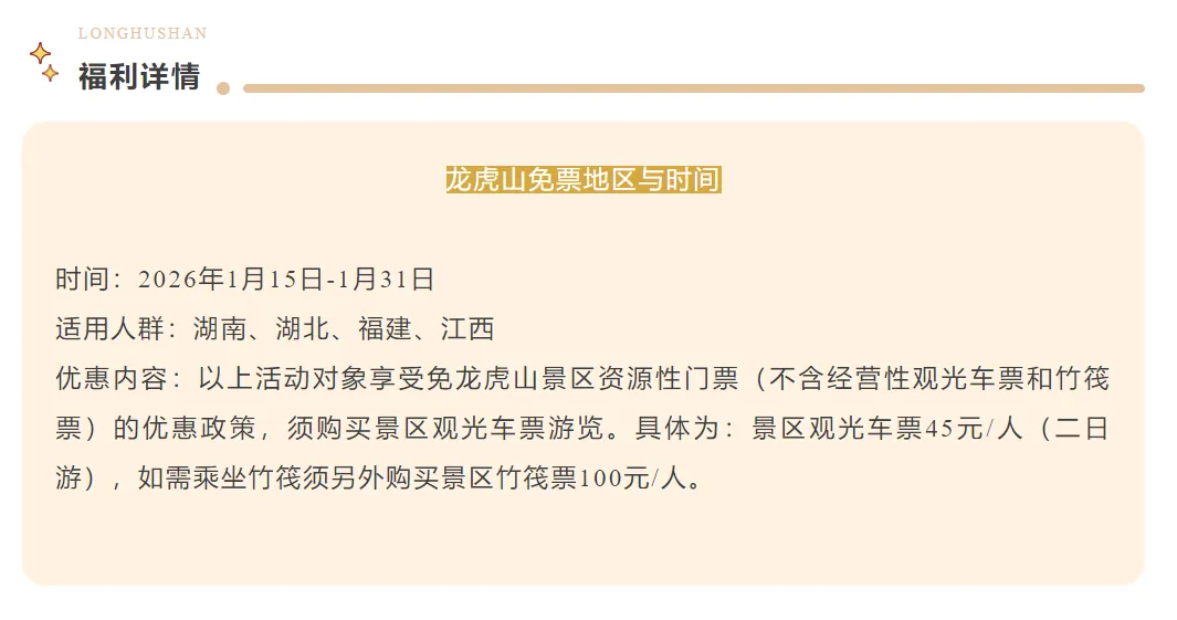 龙虎山景区近日发布公告,将于1月15日至1月31日,面向湖南、湖北、福建、江西的游客免门票。