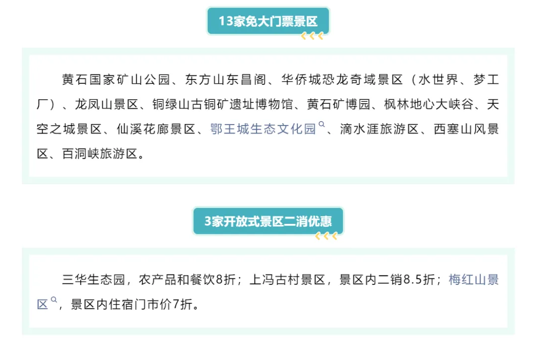 2026年全年(部分假期除外),湖北黄石13家景区向湖南永州居民免票,另有3家开放式景区推出二消优惠。