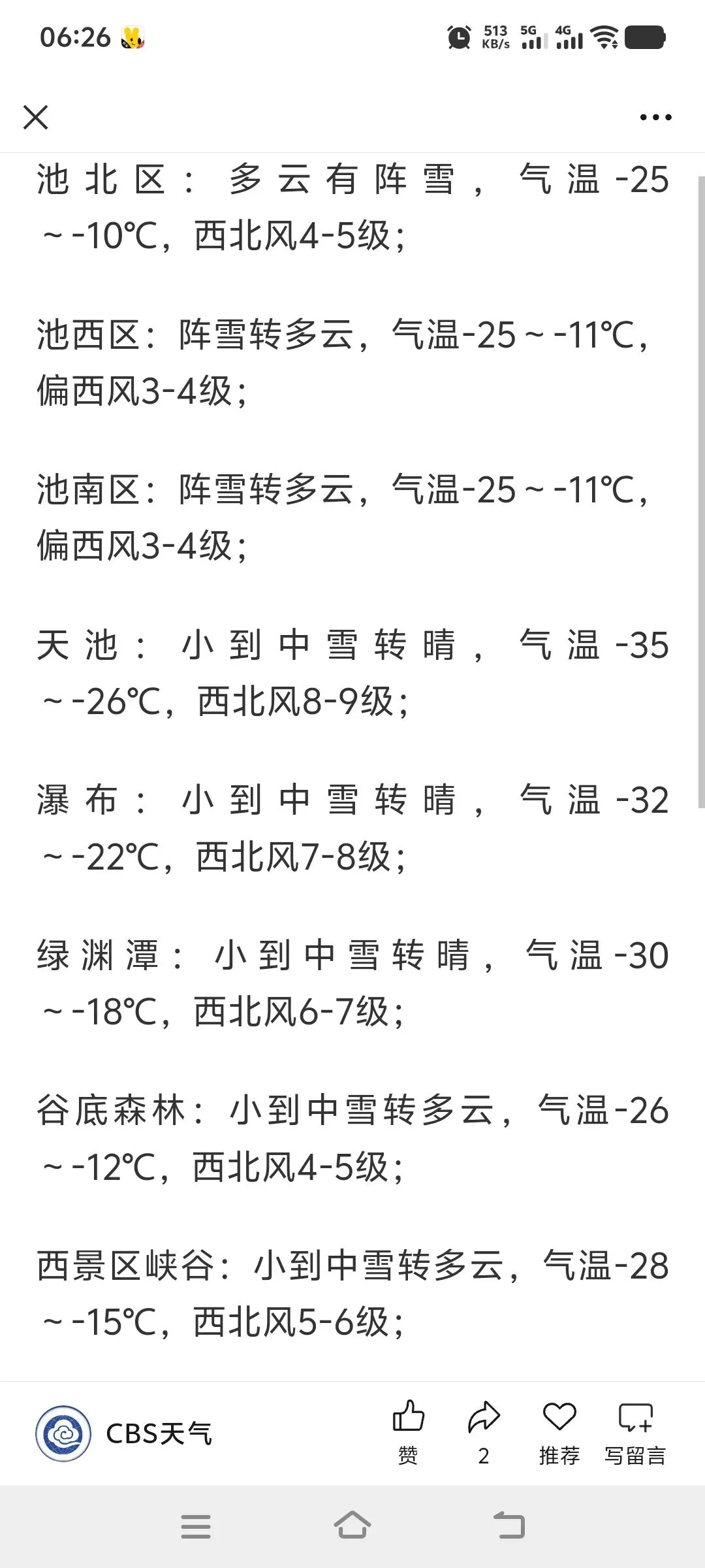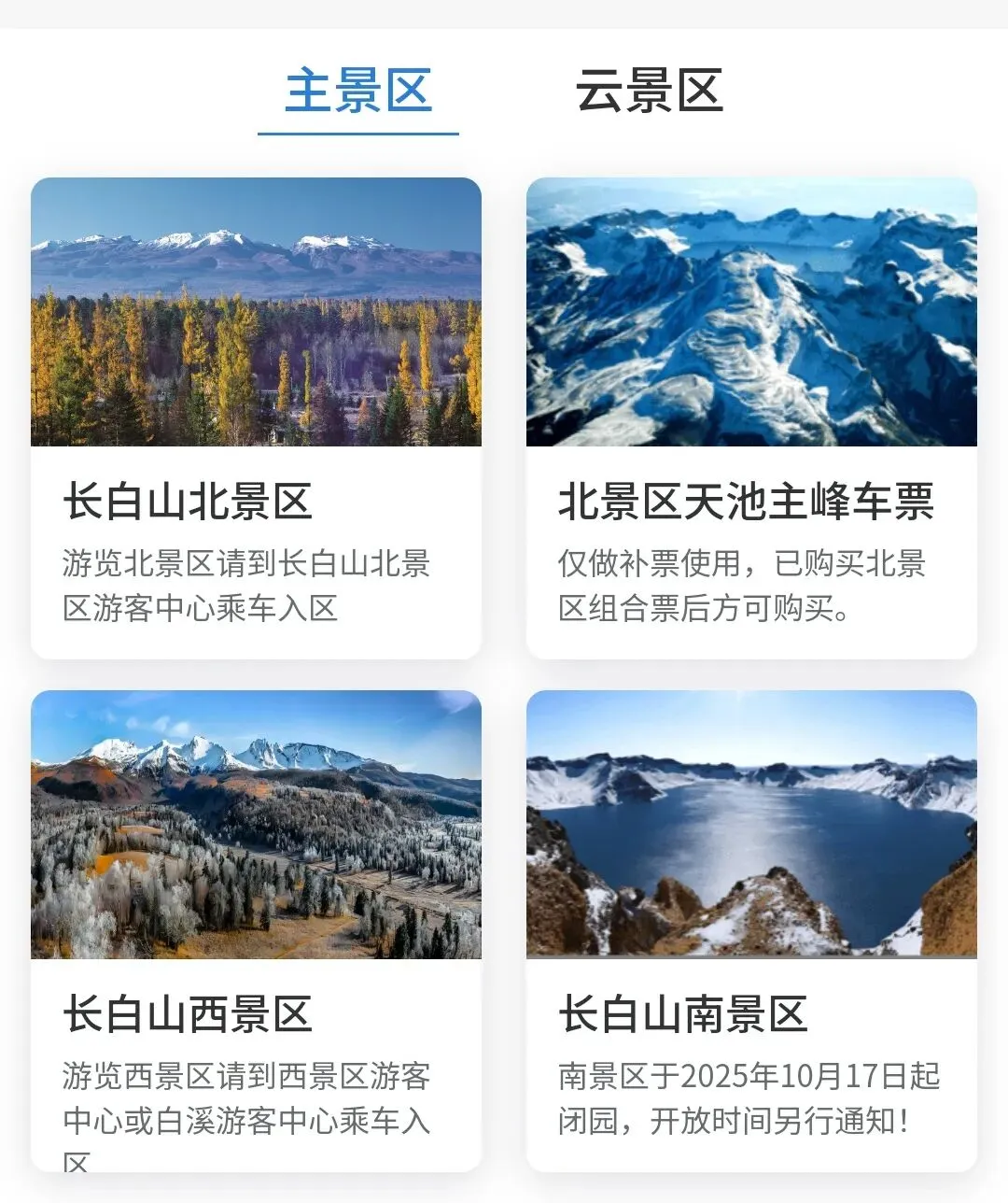 ➡️北景区降雪,风力较大,能见度较低,公路、栈道积雪结冰,不具备安全运营条件,1月13日北景区全天关闭。 ➡️西景区主峰降雪,风力较大,公路积雪结冰,不具备安全运营条件,天池景点今日关闭。粉雪谷、锦江大峡谷景点,正在清理积雪,预计延缓60分钟开放,视天气情况随时关闭。 ➡️南景区关闭。