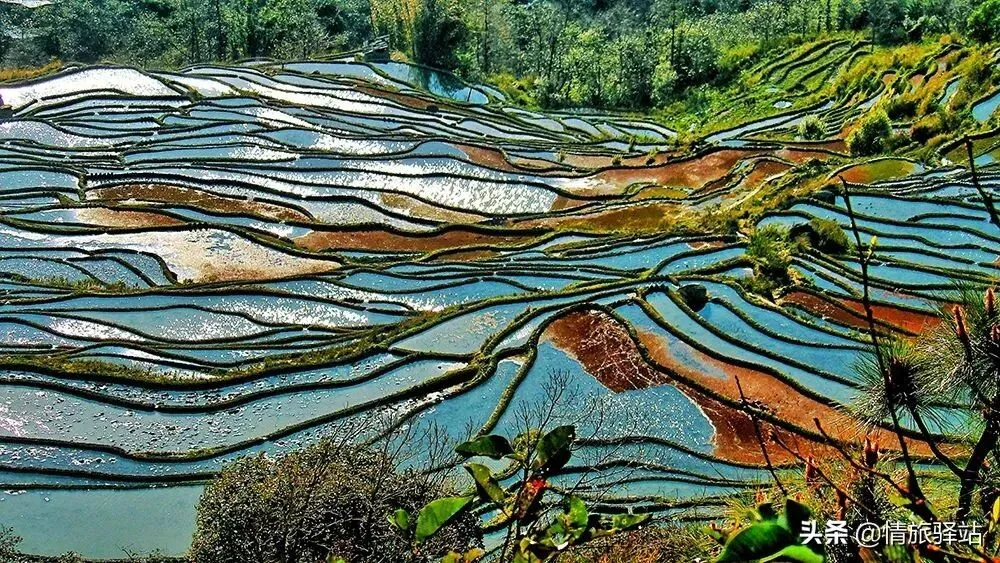 在阳光云彩和森林的掩映中,在漫漫云海的覆盖下,漫山遍野的梯田,坐落其间的山寨更加扑朔迷离,构成了千奇百态、变幻莫测的大地艺术奇观。森林、村寨、梯田、溪水相互交映,如诗如画,令人心驰神往。
