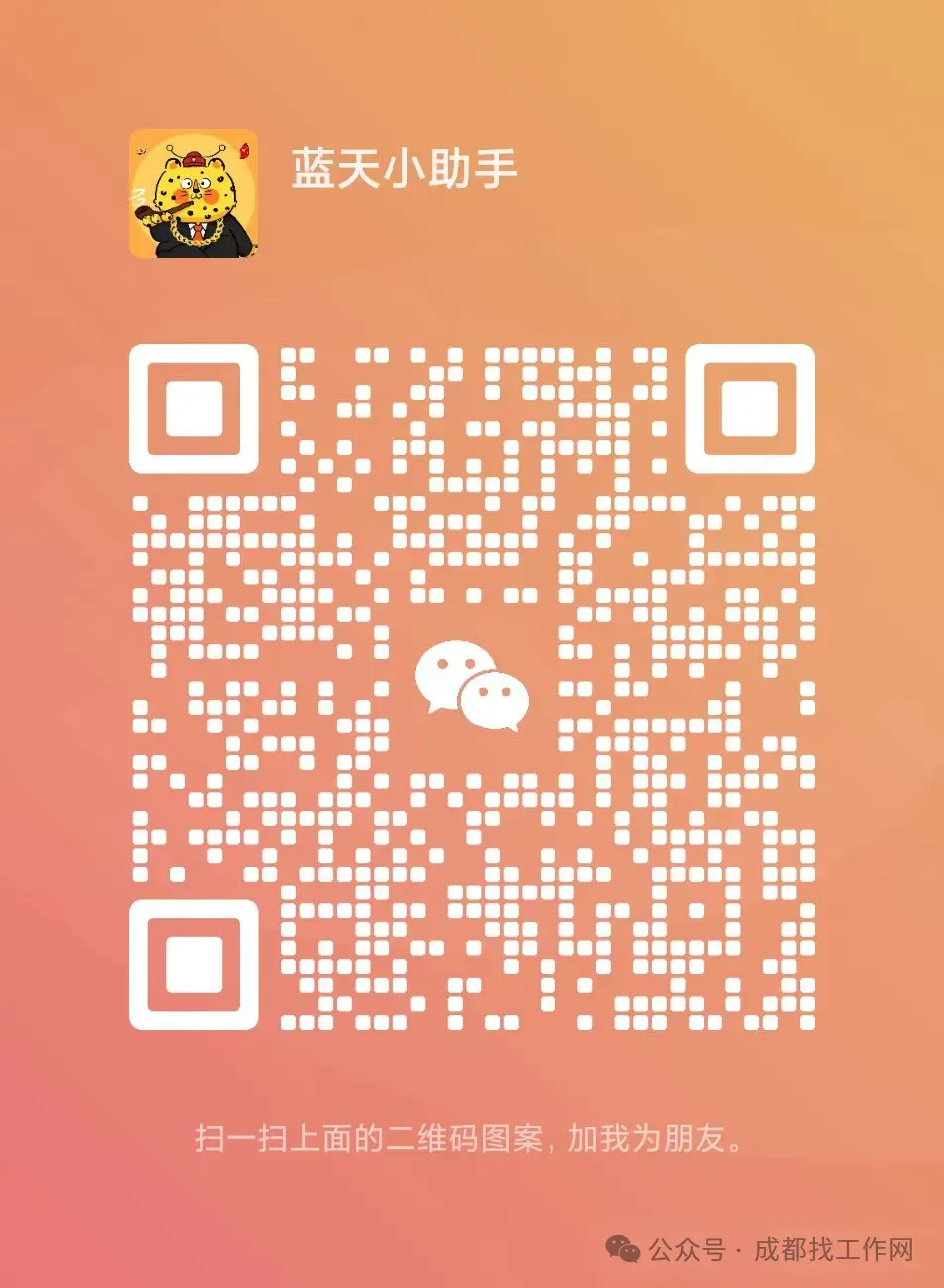 请先点击上方的蓝色字体“我在找工作呀”,再点击“关注”,即可查看成都的工作招聘信息,收到优质的招聘信息,工作全免费,不收任何费用,每天7点更新招聘信息,请放心关注。