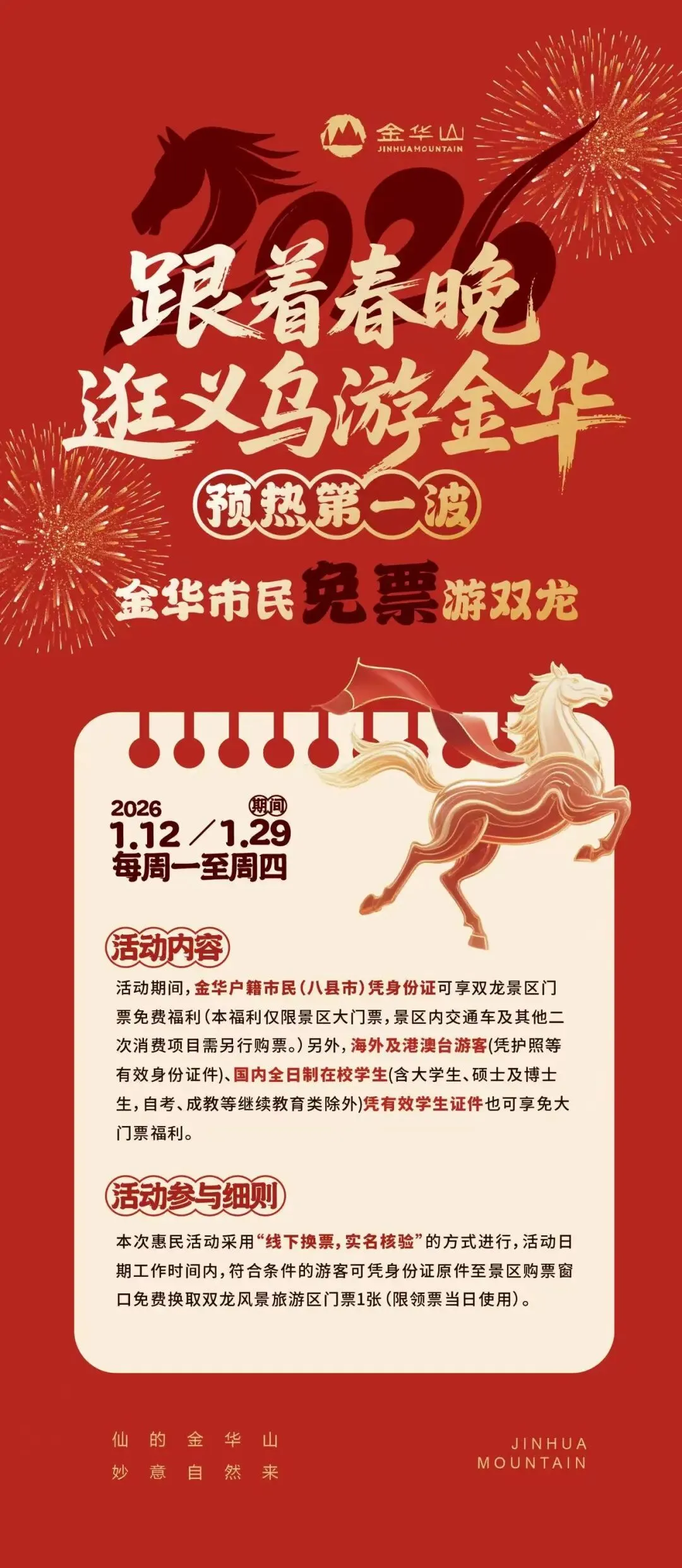 门票: 2026年1月12日-1月29日期间每周一至周四,金华人免门票(仅限大门票,入门后其它消费不免费。)