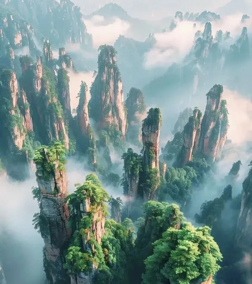 三千奇峰拔地起,八百秀水绕山流,以奇峰异石、云雾缭绕的峰林景观闻名,是《阿凡达》哈利路亚山的原型地,自然风光壮美。