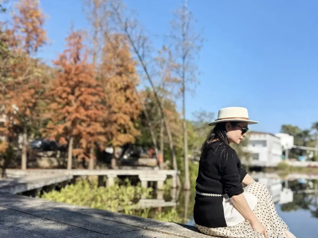 车子驶入村口,远远的就看到了湖边有几颗落羽杉已经红透了,橙红色的那种,在湛蓝的天空的映衬下,特别的美。赶紧找了个车位把车停好,下来拍照。村口湖边的落羽杉不是特别多,沿着栈道种了大概有十来颗。大部份的都已是橙红色了,有些已是焦糖色,偶尔有一些叶子是黄绿之间,几种颜色层层叠叠,倒映在澄澈的湖水中,像极了大自然打翻的调色盘,把古村的冬日晕染得温暖而热烈。湖中落羽杉的旁边都修有栈道,往栈道上一坐,一张美美的照片就出来了。