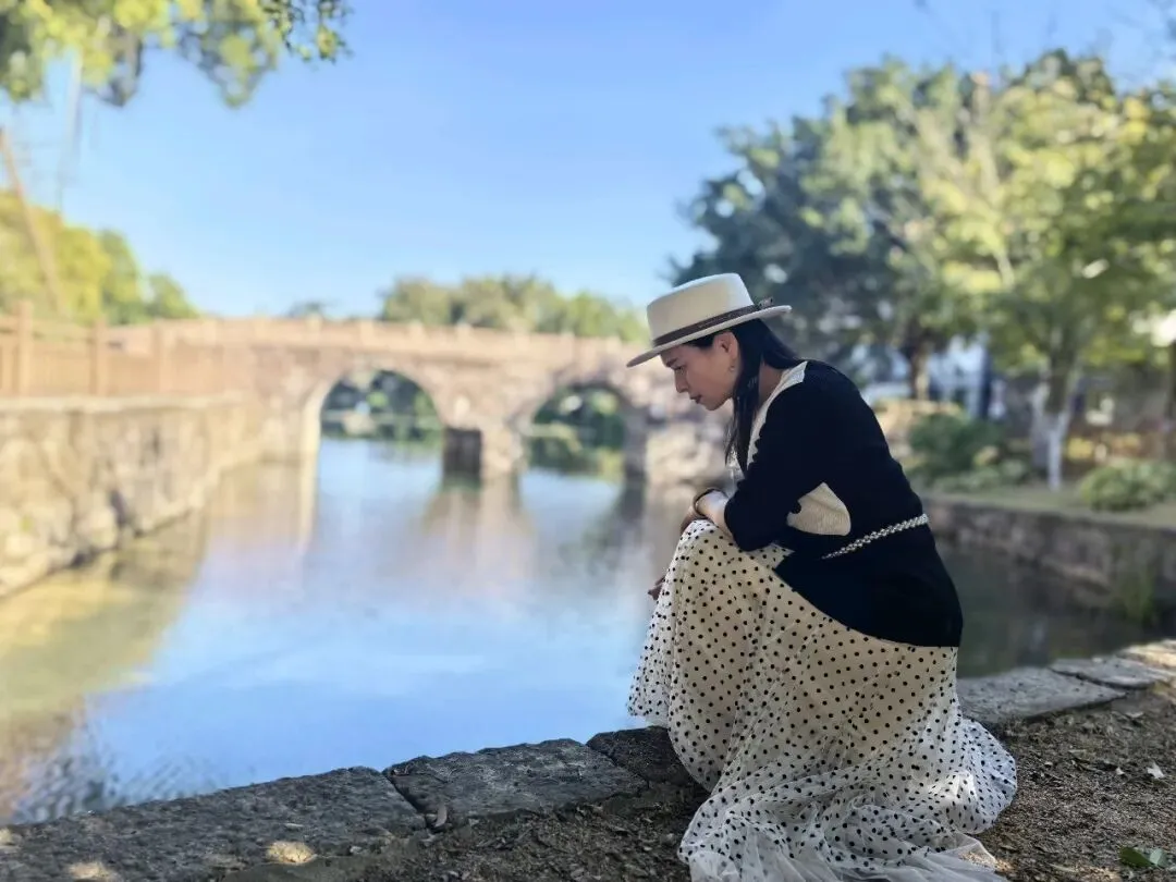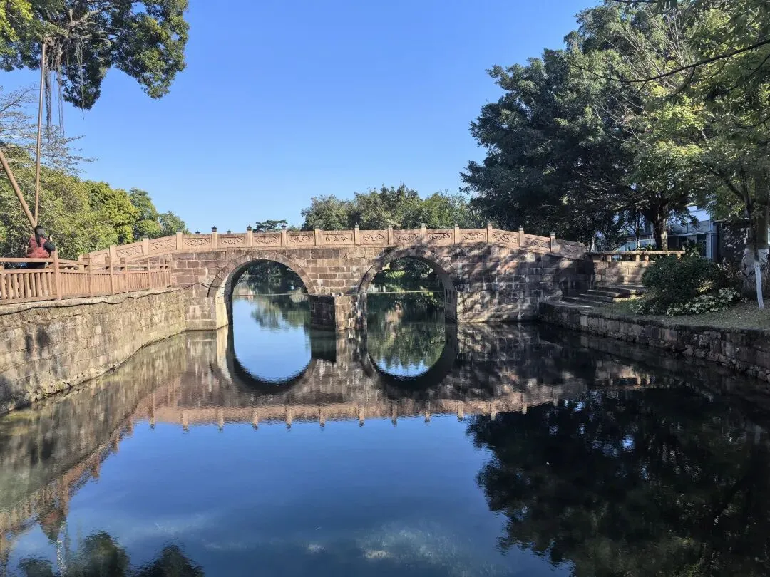 沿着湖边继续往前走,一直走到码头那里,才发现。这里才是莲塘古村落羽杉的最佳观赏点。这片环湖而生的羽杉林,是莲塘古村冬日最动人的主角——进入1月份的落羽杉,色彩越发的浓烈 。阳光斜照时,树冠被镀上一层暖金,树影倒映在水中,与水上的月亮桥交织成对称的梦幻图景,随手一拍都是无需滤镜的大片。真的美到让人惊艳。