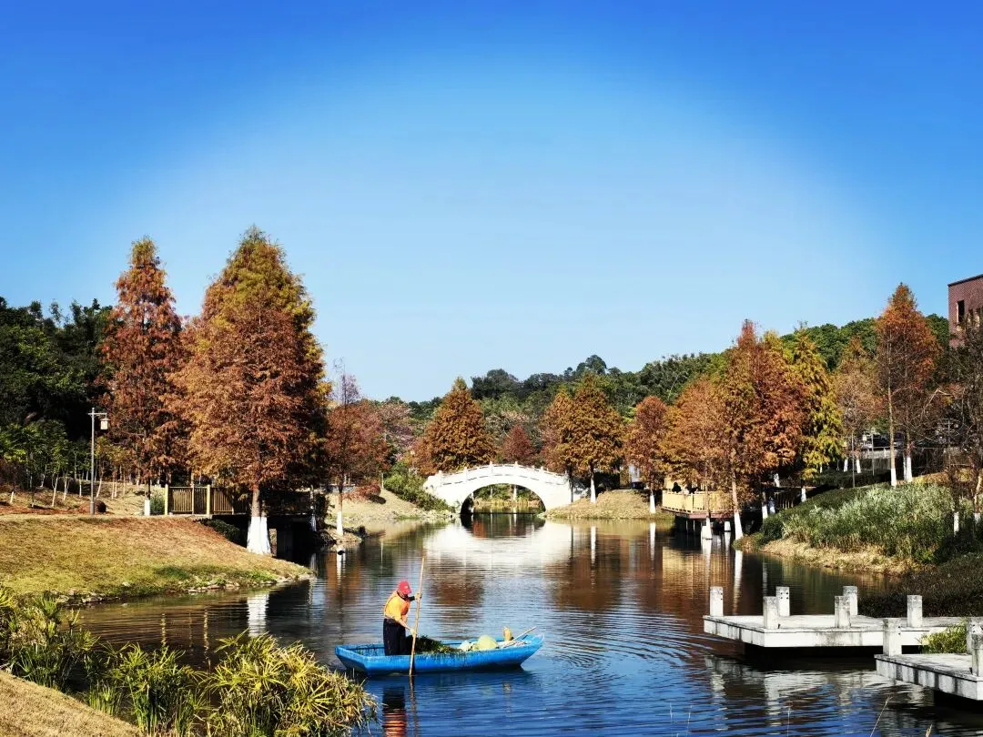 这里没有网红景区的人挤人,只有“山—村—水—田”的广府传统格局静静铺展。麻石巷道被岁月磨得温润,百年古榕的枝叶垂落如帘,时四陈公祠的镬耳山墙高耸挺拔,檐下壁画与木雕仍清晰可见,一口南宋古井至今清冽,仿佛能听见时光的回响 。而青莲戏台上“一曲百年”的匾额,默默诉说着昔日粤韵悠扬的盛景,与不远处燃烧的羽杉林相映,构成一幅动与静、古与今交织的绝美画卷。