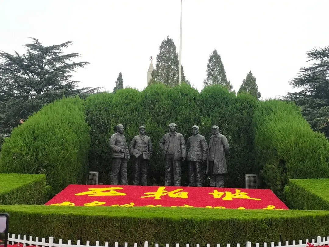 五大书记铜像,鲜花和翠柏环拥其间。