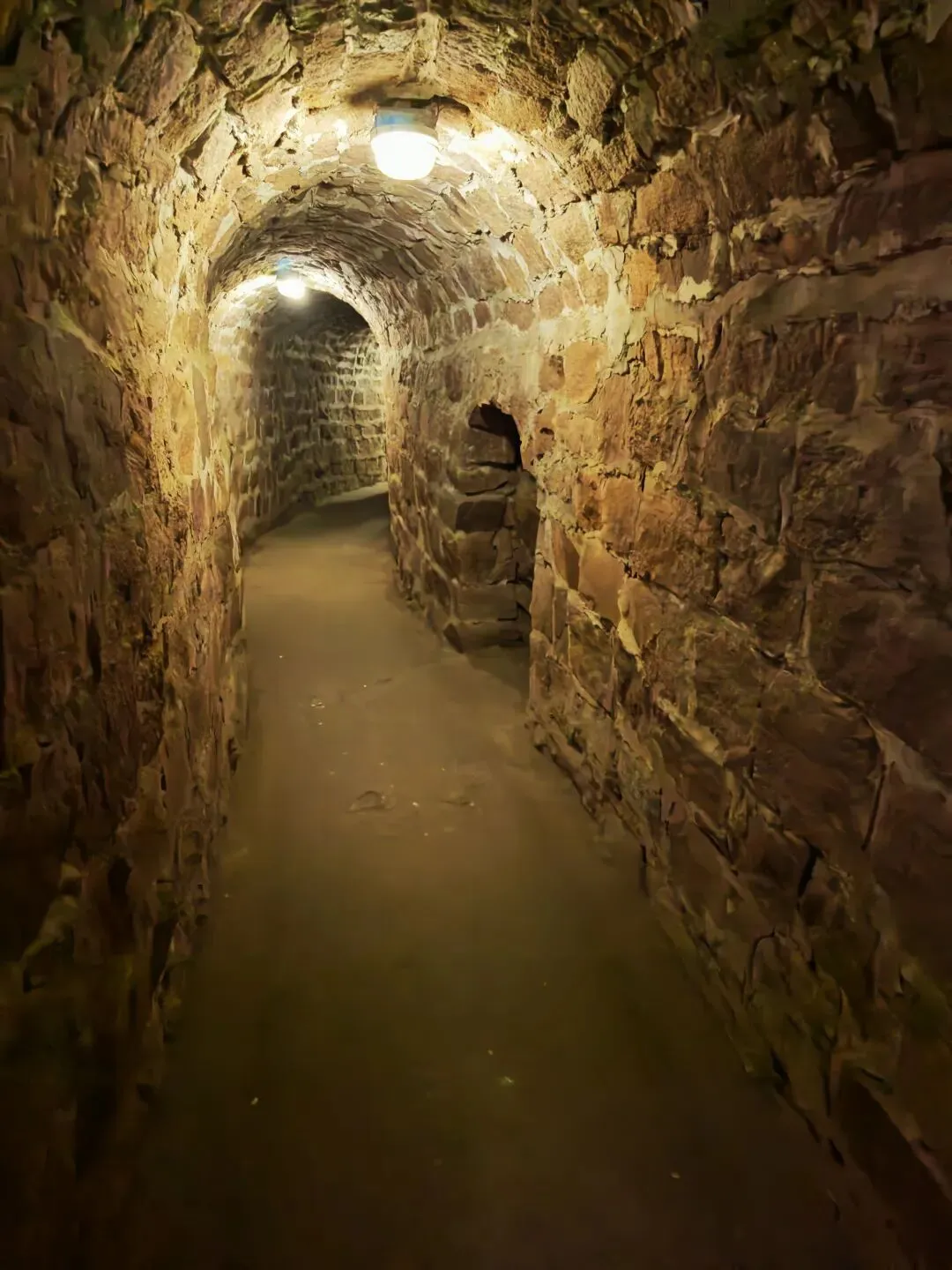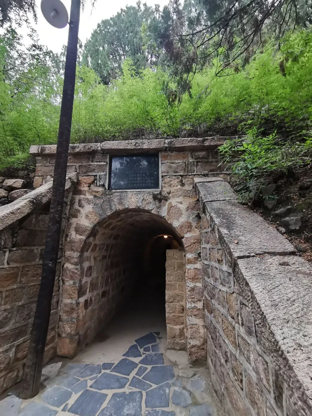 防空洞。全长二百三十二米。共有四个洞口。分别在毛泽东旧居刘少奇旧居后边,七届二中全会会址东边,朱德旧居对面。毛泽东旧居后面山上有个报警钟,敌机来时便敲钟发出警报。敌机走后,发出解除警报的信号。