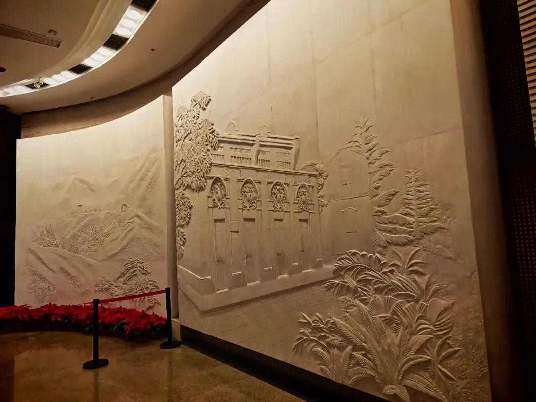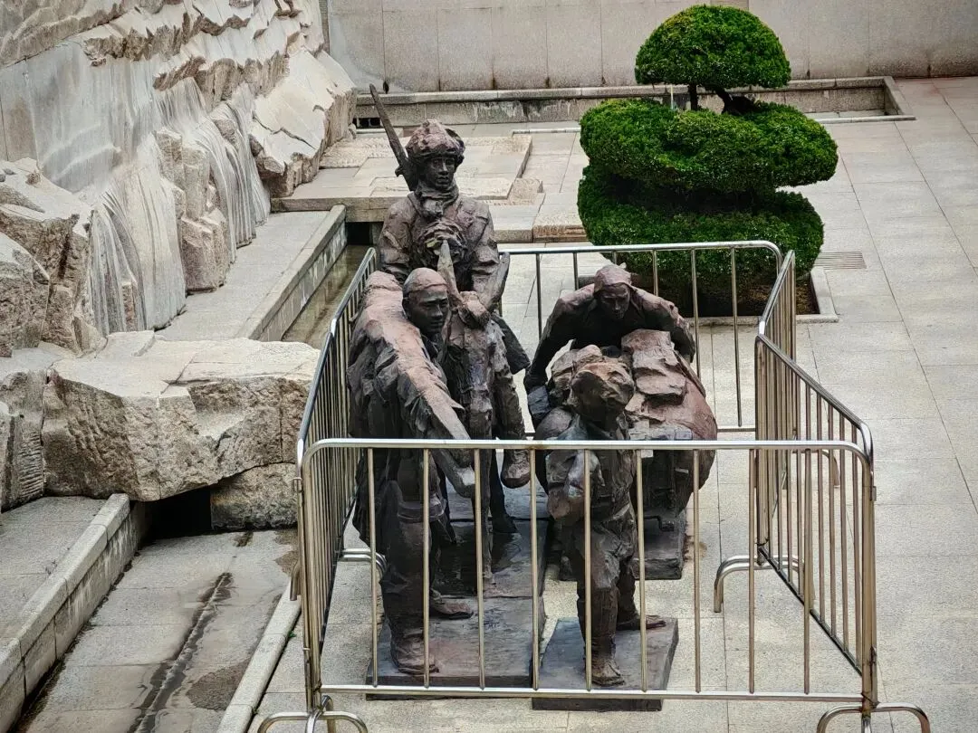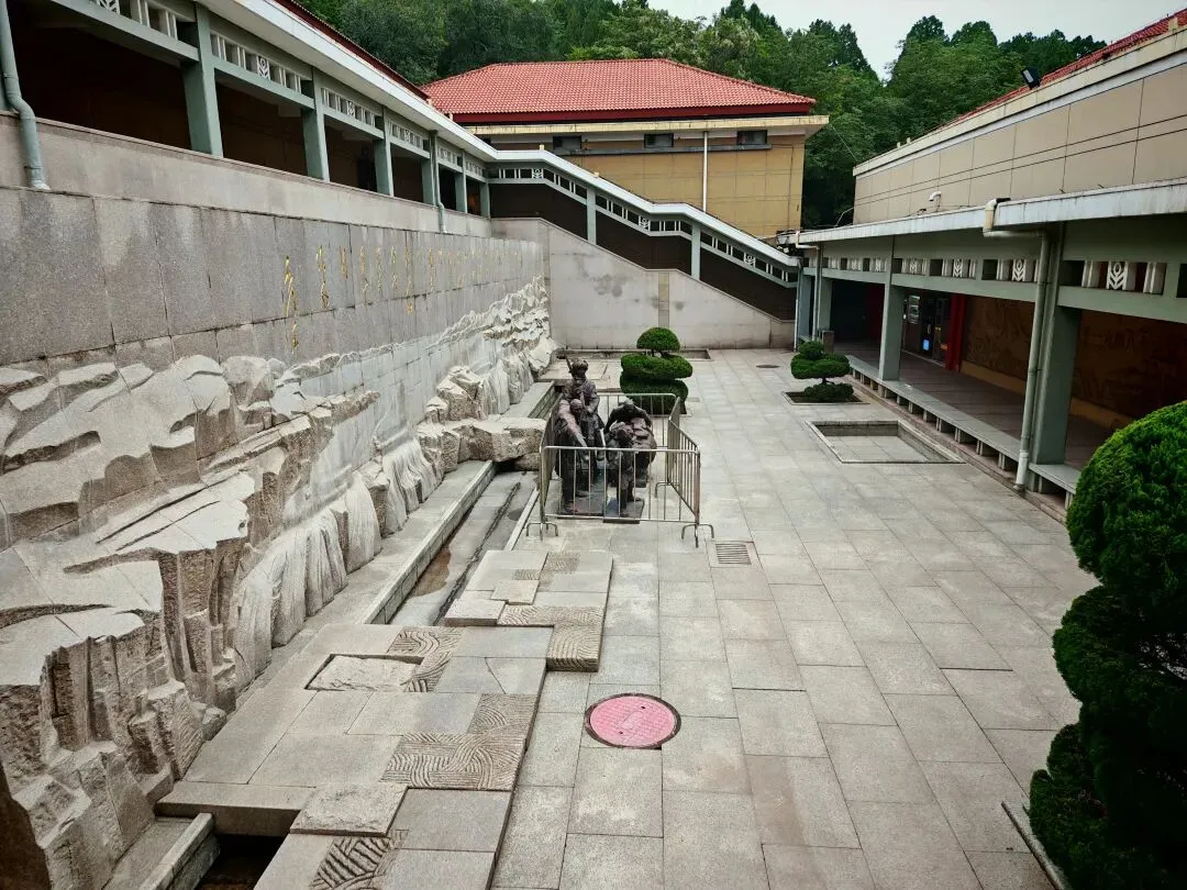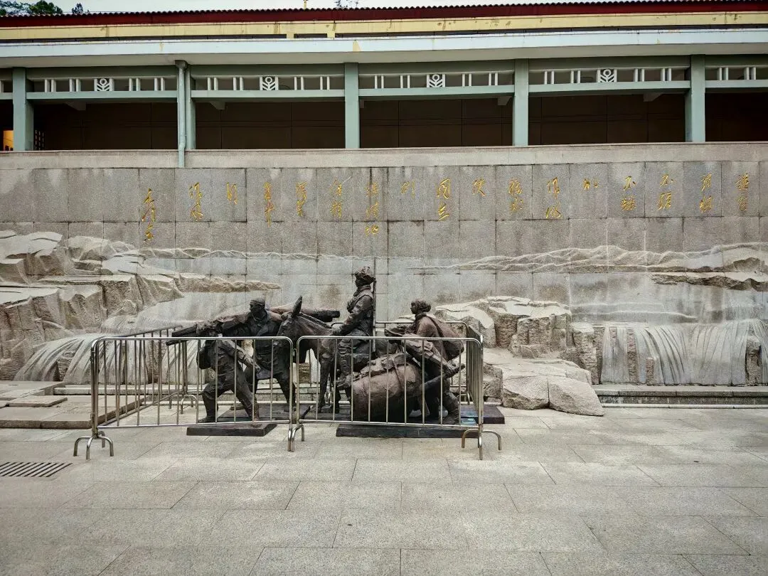 沿水库边的山路向前直走,便是宽阔的西柏坡纪念馆广场。广场中央是五大书记雕像。